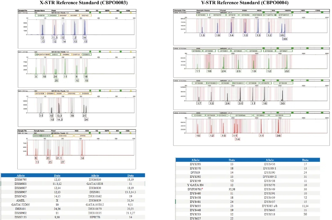 X染色體標(biāo)準(zhǔn)品包含19個X-STR基因座和一個性別位點(diǎn)Amelogenin。Y染色體標(biāo)準(zhǔn)品包含22個低頻突變Y-STR基因座和7個高頻突變Y-STR基因座。低頻突變和高頻突變基因座相結(jié)合具有更高的個體識別能力,提供了強(qiáng)大的兼容性和排查能力。