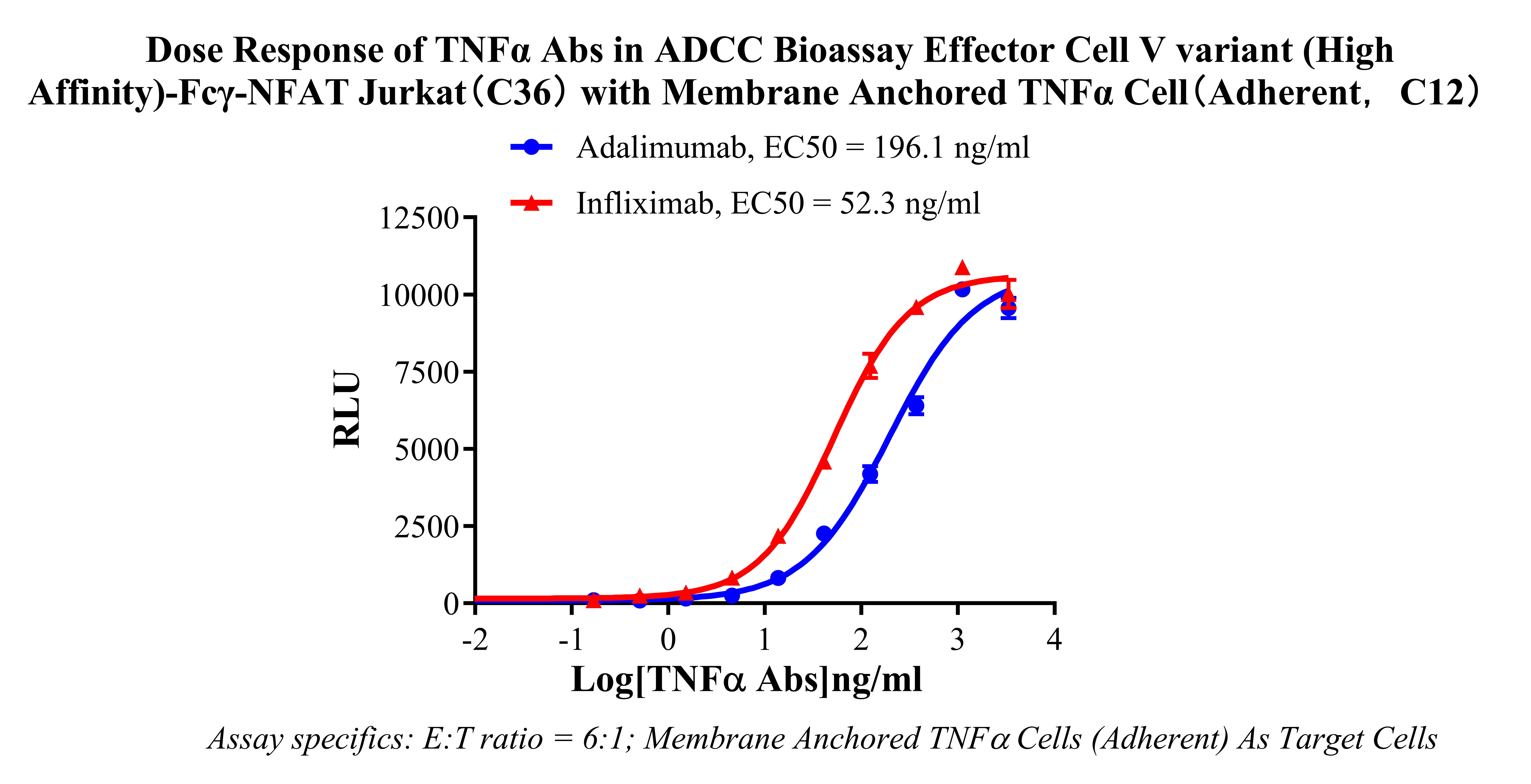 Figure 2. Dose response of TNFα Abs in ADCC Bioassay Effector Cell (High Affinity)-Fcγ-NFAT-Jurkat (C36) With Membrane Anchored TNFα Cell (Adherent, C12).