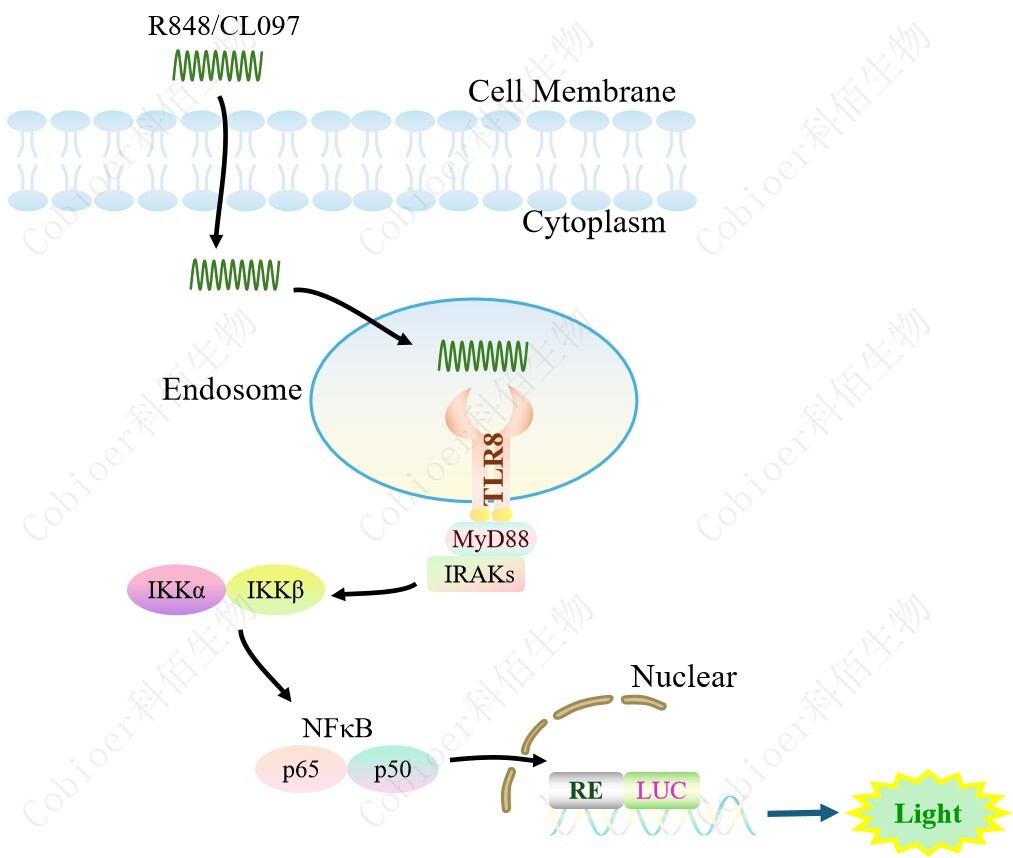TLR8 NFκB-Luc HEK293 報告基因藥靶模型很好的模擬了體內 TLR8 的信號轉導過程, 原理見下圖所示。
