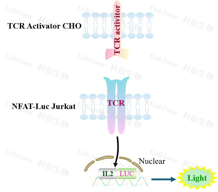 TCR Activator CHO 報(bào)告基因藥靶模型很好的模擬了體內(nèi) TCR 的信號轉(zhuǎn)導(dǎo)過程,原理見下圖所示。![]() Figure 1. TCR Activator CHO 細(xì)胞模型原理圖 |