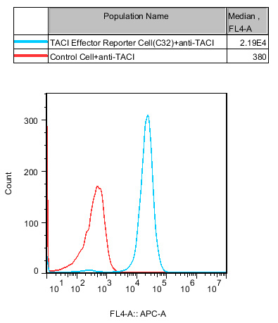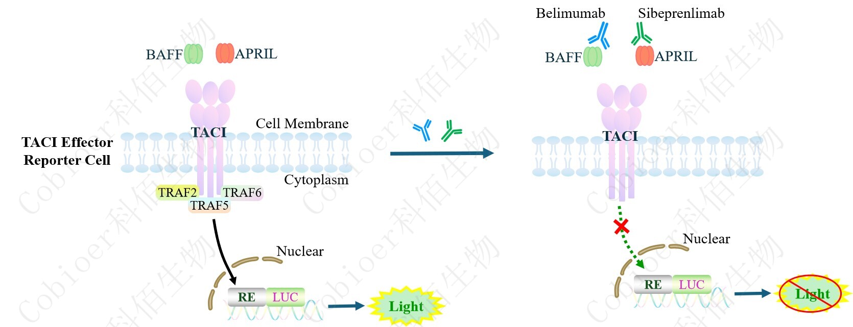 TACI Effector Reporter Cell 報(bào)告基因藥靶模型很好的模擬了體內(nèi) TACI 的信號(hào)轉(zhuǎn)導(dǎo)過(guò)程, 原理見(jiàn)下圖所示。![]() Figure 1. TACI Effector Reporter Cell 模型原理圖 |