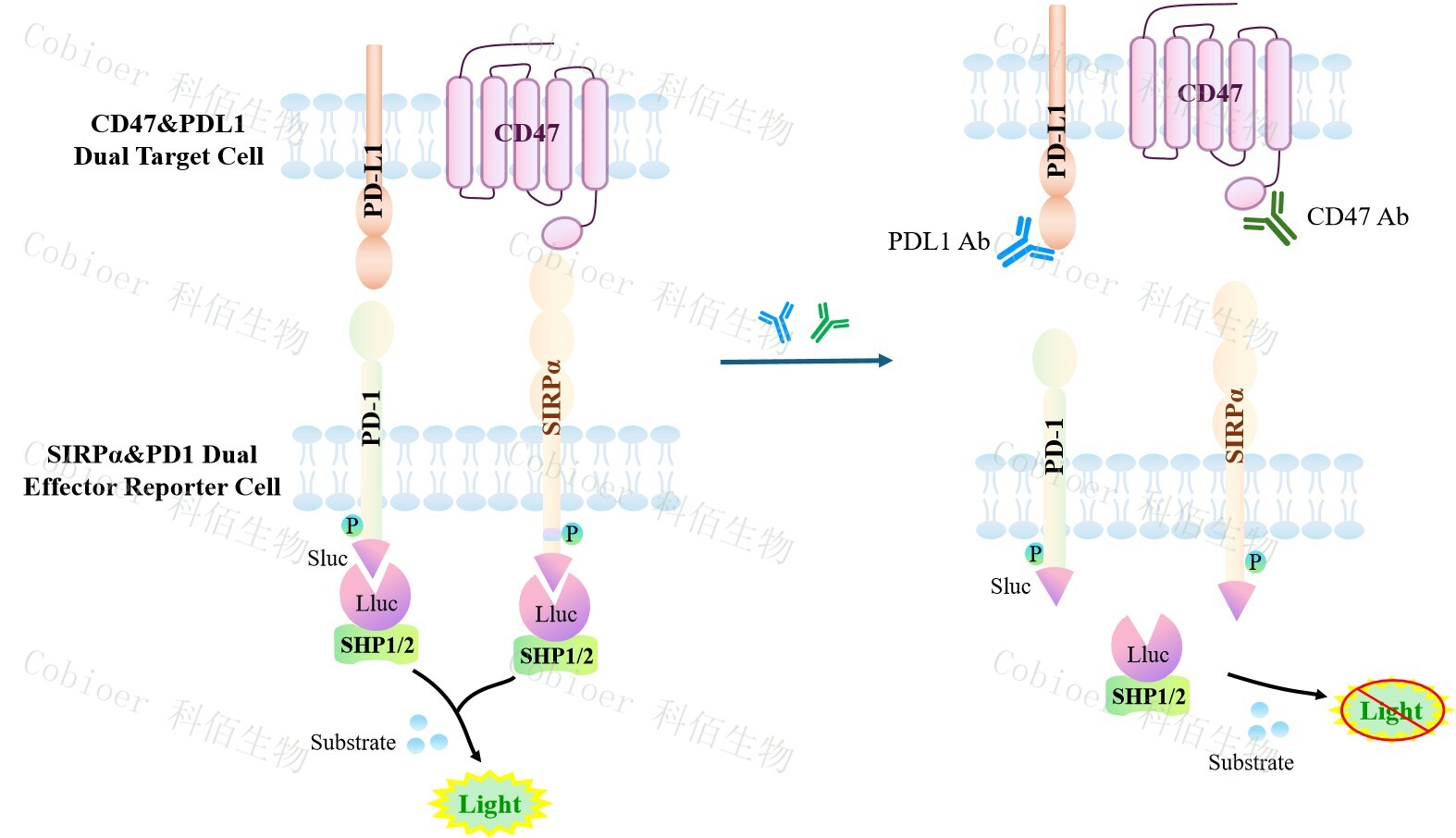 SIRPα&PD1 Dual Effector Reporter Cell 報 告 基 因 藥 靶 模 型 很 好 的 模 擬 了 體 內(nèi) SIRPα&PD1 的信號轉(zhuǎn)導(dǎo)過程,原理見下圖所示。
