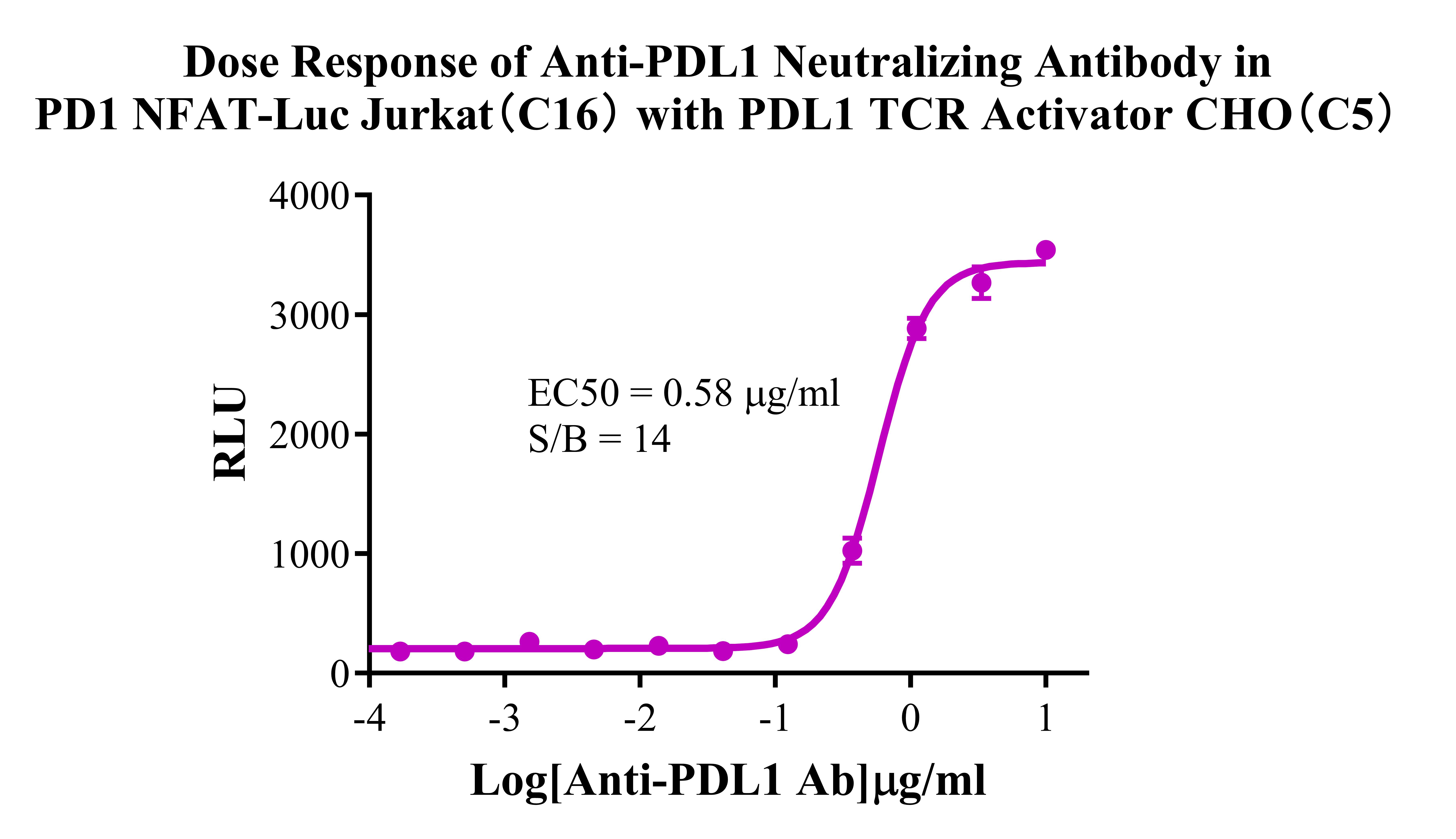 Figure 4. Detect Luciferase assay by Ultra Luciferase Detection Kit CBPH0001(we strongly suggest to purchase from Cobioer). Dose response of Anti-PDL1 Neutralizing Antibody in PD1 NFAT-Luc Jurkat(C16) with PDL1 TCR Activator CHO(C5)..