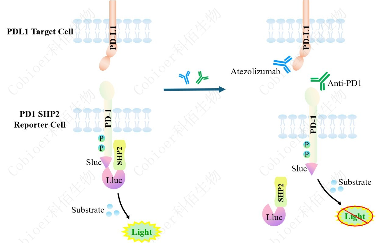 PD1 SHP2 Reporter Cell 報(bào)告基因藥靶模型很好的模擬了體內(nèi) PD1/SHP2 的信號(hào)轉(zhuǎn)導(dǎo)過(guò)程,原理見下圖所示。