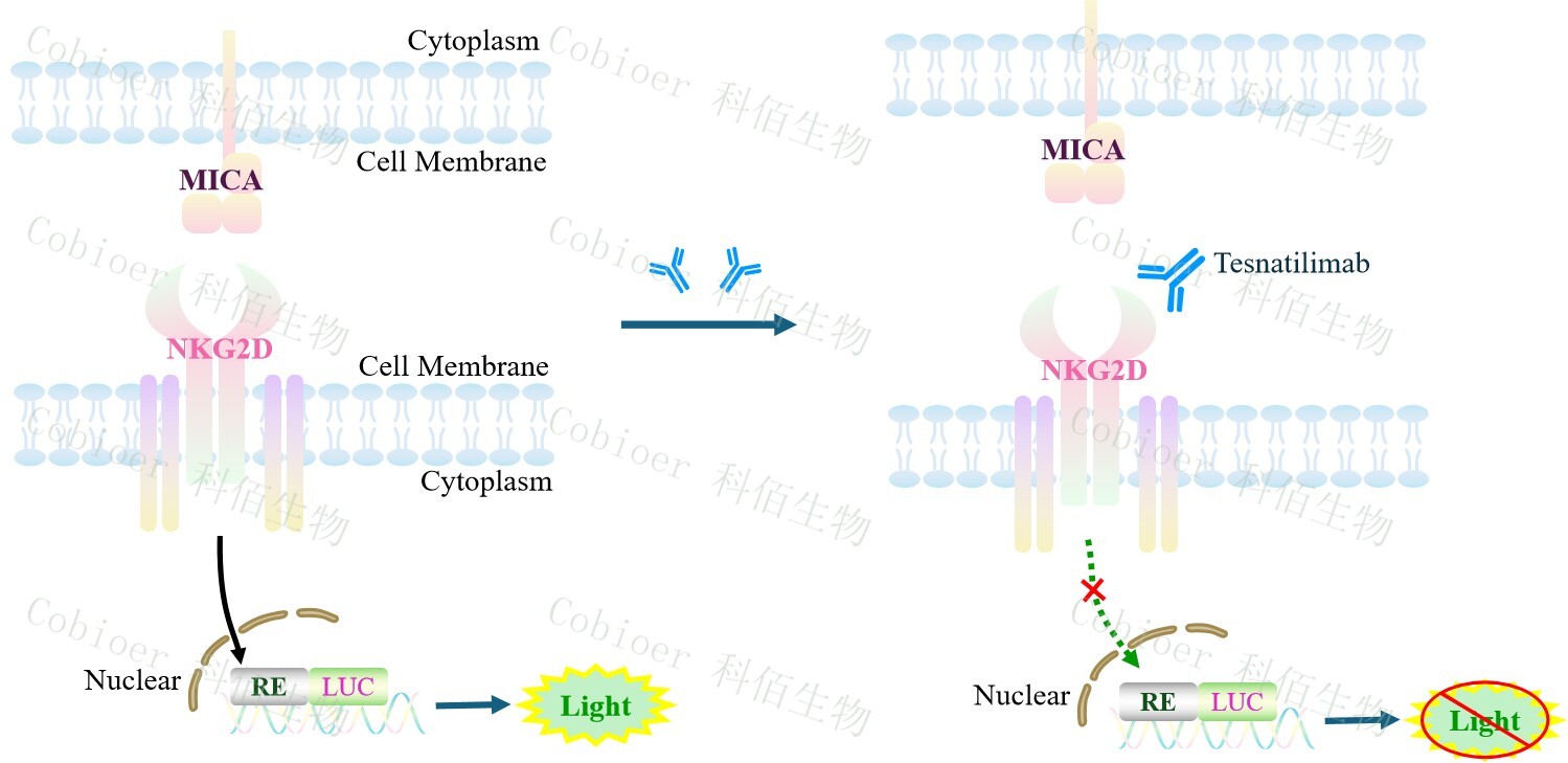 MICA CHO 作為 NKG2D Effector Reporter Cell 的靶細胞,很好的模擬了體內 NKG2D 的信號轉導過程,原理見下圖所示。