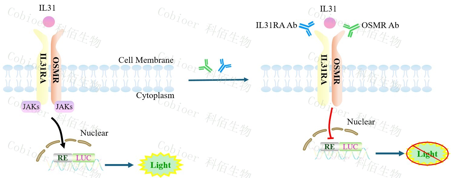 IL31 Effector Reporter報告基因藥靶模型很好的模擬了體內(nèi) IL31的信號轉(zhuǎn)導(dǎo)過程,原理見下圖所示。![]() Figure 1. IL31 Effector Reporter Cell 細胞模型原理圖