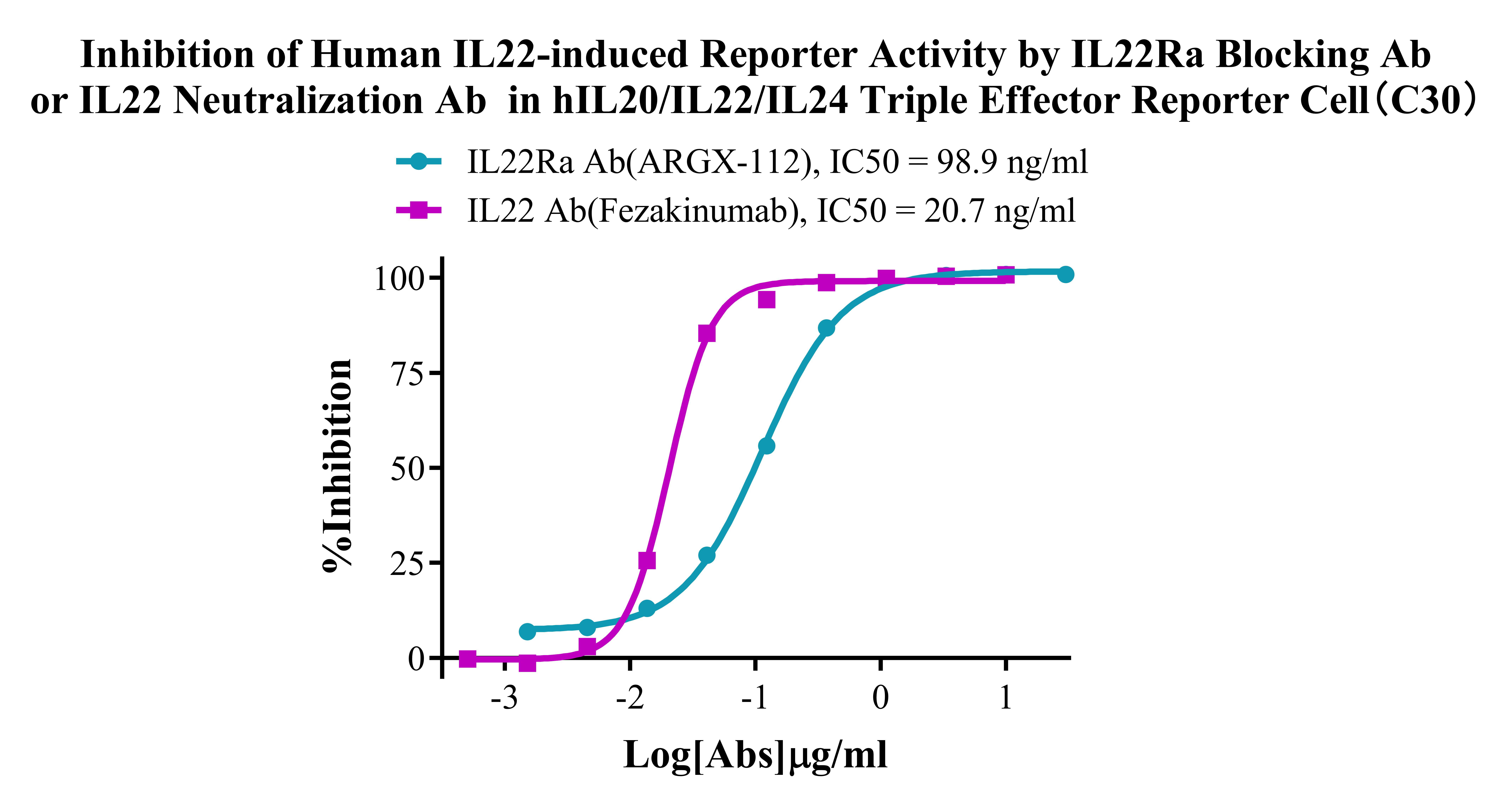 IV. Representative Data Figure 2. Recombinant hIL20/IL22/IL24 Triple Effector Reporter Cell stably expressing IL22Rα. Figure 3. Dose Response of Ligands in hlL20/IL22/lL24 Triple Effector Reporter Cell(C30). Figure 4. Inhibition of Human lL22-induced Reporter Activity by lL22Ra Blocking Ab or lL22 Neutralization Ab in hIL20/IL22/IL24 Triple Effector Reporter Cell(C30). Figure 5. Inhibition of Human lL20-induced Reporter Activity by lL20 Neutralization Ab in hlL20/IL22/IL24 Triple Effector Reporter Cell(C30). |