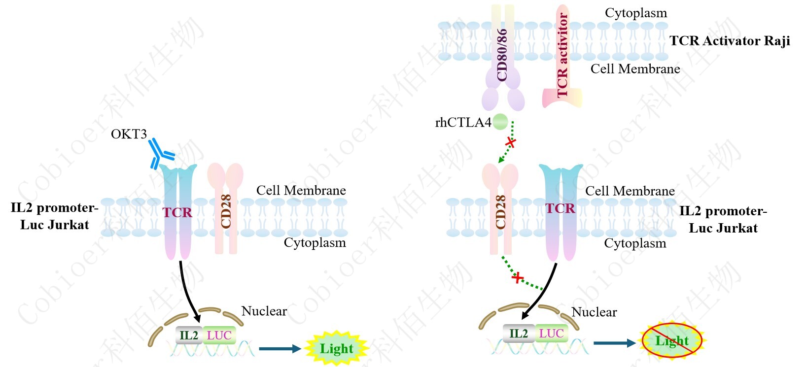 IL2 promoter-Luc Jurkat 報告基因藥靶模型很好的模擬了體內(nèi) IL2 的信號轉(zhuǎn)導過程,原 理見下圖所示。
