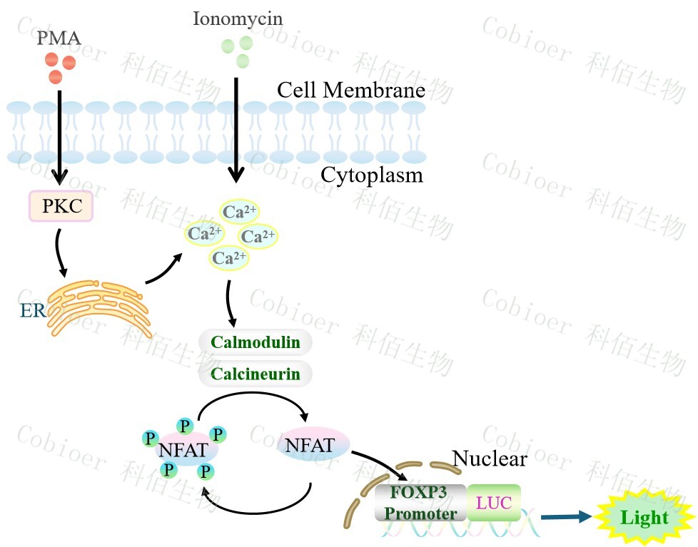 FOXP3 promoter-Luc Jurkat 報告基因細(xì)胞,是由 FOXP3 調(diào)控并表達(dá) Luc 熒光素酶報告基因的 Jurkat 細(xì)胞。PMA 是 DAG(二酯酰甘油)的類似物,可自由的通過 細(xì)胞膜,可用于測定 CD3/CD28 介導(dǎo)的 T 細(xì)胞活化,原理見下圖所示。 Figure 1. FOXP3 promoter-Luc Jurkat 細(xì)胞模型原理圖 |
