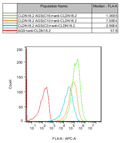 Claudin18是位于細胞膜表面緊密連接的主要成分,它在維持細胞極性和屏障功能以及促進耐酸能力方面起著重要作用。CLDN18的第一個外顯子可以選擇性剪接,形成兩個具有高度同源氨基酸序列的不同剪接突變體(CLDN18.1和CLDN18.2)。跨膜蛋白CLDN18由兩個細胞外環(huán)、四個跨膜結(jié)構(gòu)域和一個細胞質(zhì)結(jié)構(gòu)域組成。 |