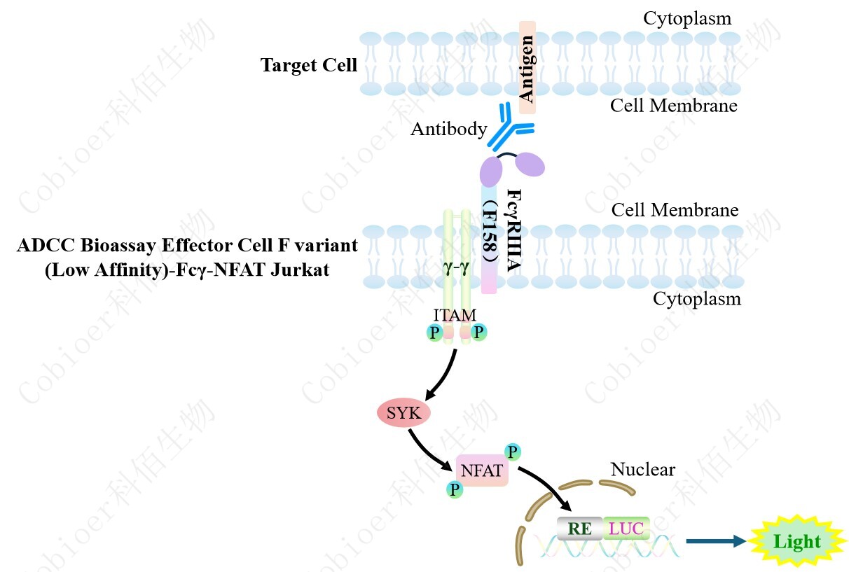 ADCC Bioassay Effector Cell F variant (Low Affinity)-Fcγ-NFAT Jurkat 報告基因藥靶模型 很好的模擬了體內(nèi) ADCC 的信號轉(zhuǎn)導(dǎo)過程,原理見下圖所示。