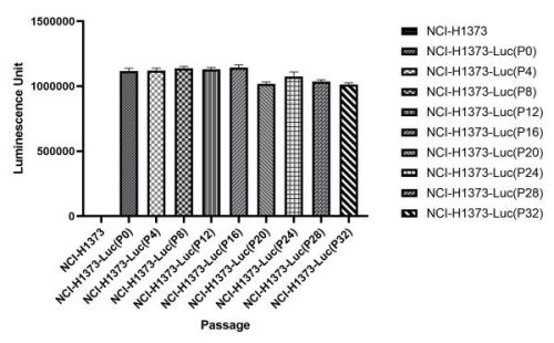 Figure. Stablity test results. NCI-H1373-Luc cells showed at least 32 passage stability with similar luminescence unit.