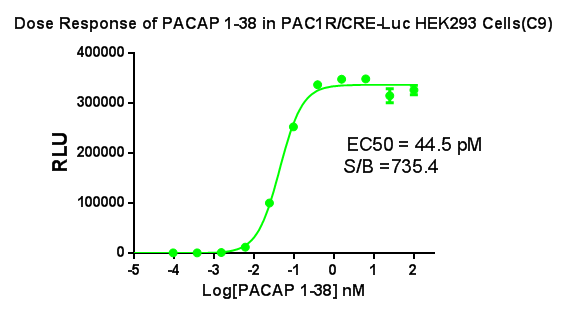 Figure 2.Detect Luciferase assay by Ultra Luciferase Detection Kit CBPH0001(we strongly suggest to purchase from Cobioer). Dose Response of PACAP 1-38 in PAC1R/CRE-Luc HEK293 Cells(C9).