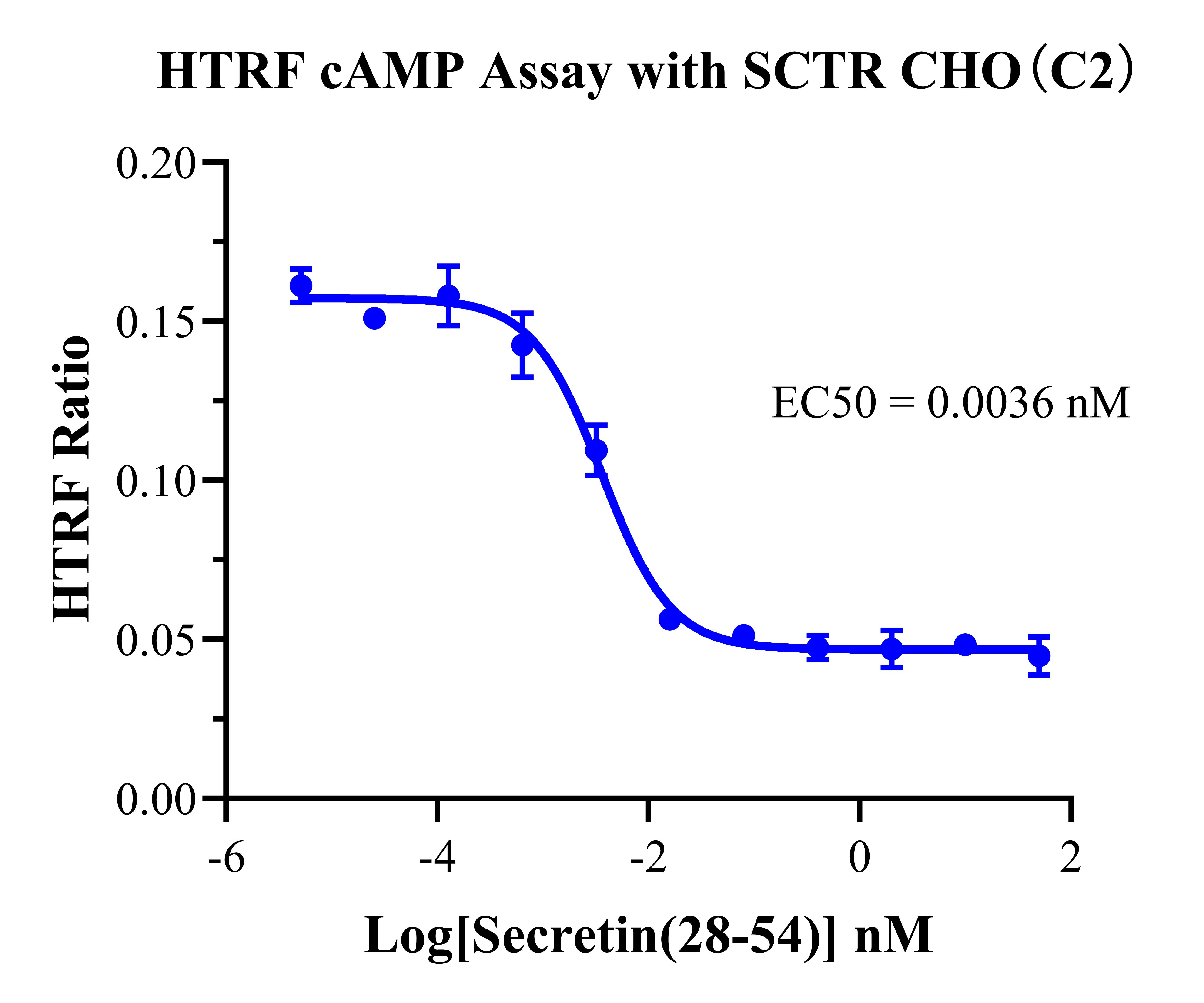 cAMP 在 G 蛋白偶聯(lián)受體(GPCR)信號轉導中是一種關鍵的第二信使。當配體結合到 GPCR, 構象發(fā)生變化,激活受體接著激活 G 蛋白,Gs 的激活導致腺苷酸環(huán)化酶調控 cAMP 的升高。 SCTR 藥靶模型很好的模擬了體內 SCTR 的信號轉導過程,原理見下圖所示。 |