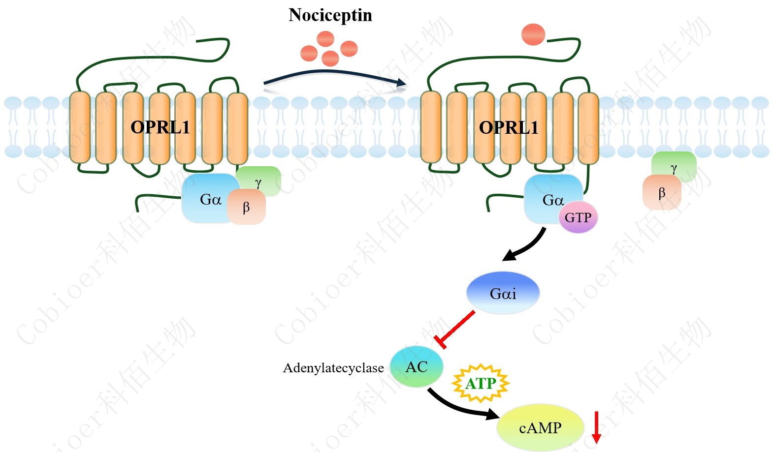 cAMP 在 G 蛋白偶聯(lián)受體(GPCR)信號轉(zhuǎn)導中是一種關鍵的第二信使。當配體結合到 GPCR,構象發(fā)生變化,激活受體接著激活 G 蛋白,Gi 的激活導致腺苷酸環(huán)化酶調(diào)控 cAMP 的下調(diào)。OPRL1 CHO 藥靶模型很好的模擬了體內(nèi) OPRL1 的信號轉(zhuǎn)導過程,原理見下圖所示。 |
