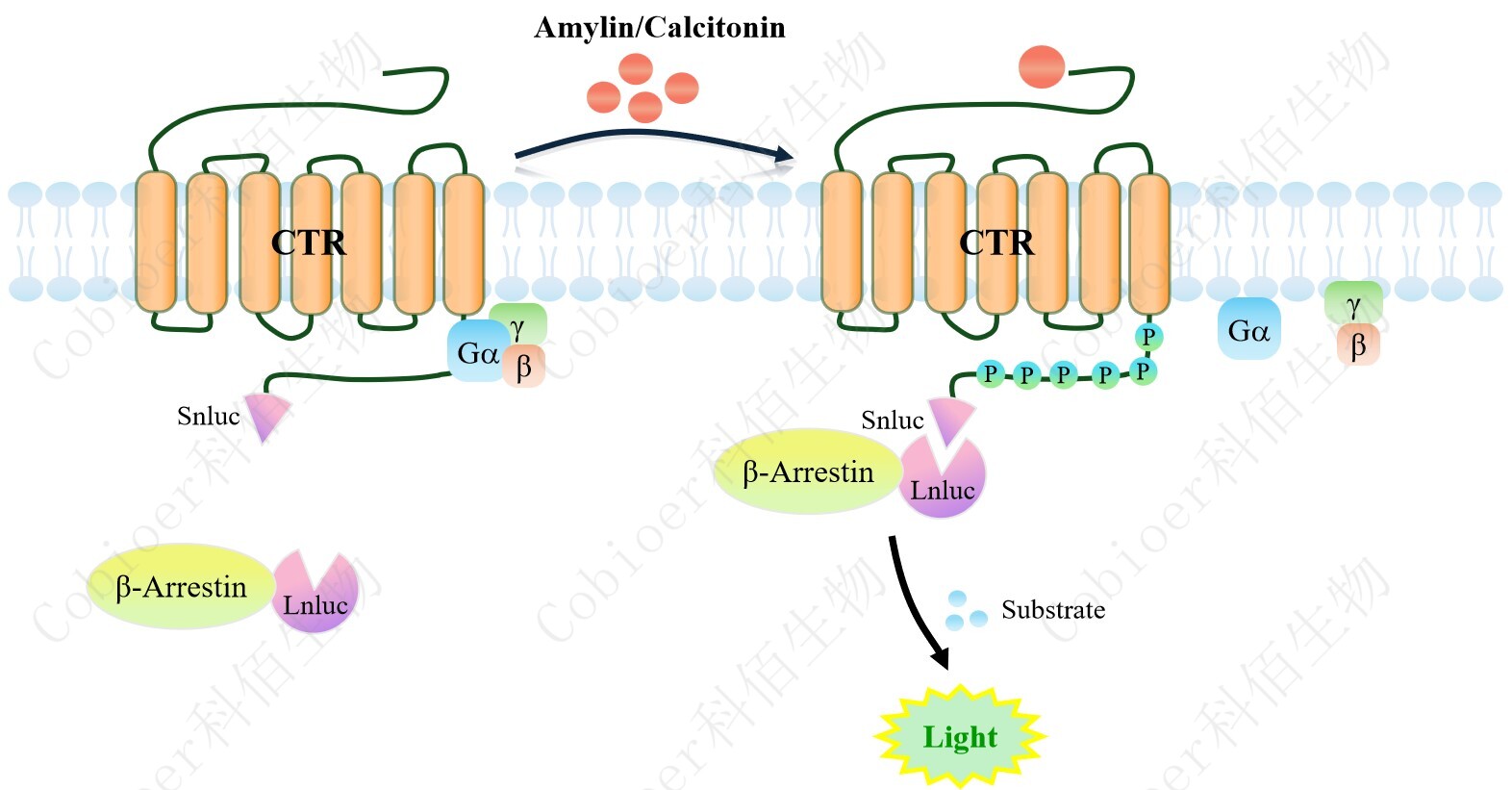 CTR β-Arrestin CHO 報(bào)告基因藥靶模型很好的模擬了體內(nèi) CTR/β-Arrestin 的信號(hào)轉(zhuǎn)導(dǎo)過程,原理見下圖所示。當(dāng)缺乏配體刺激時(shí),β-Arrestin 不與 CTR 結(jié)合,融合β-Arrestin 的 熒光素酶處于失活構(gòu)象;當(dāng) CTR 遭遇配體刺激時(shí),融合熒光素酶報(bào)告基因的β-Arrestin 被招募,使熒光素酶報(bào)告基因處于激活狀態(tài),加入其底物后發(fā)光信號(hào)增強(qiáng)。