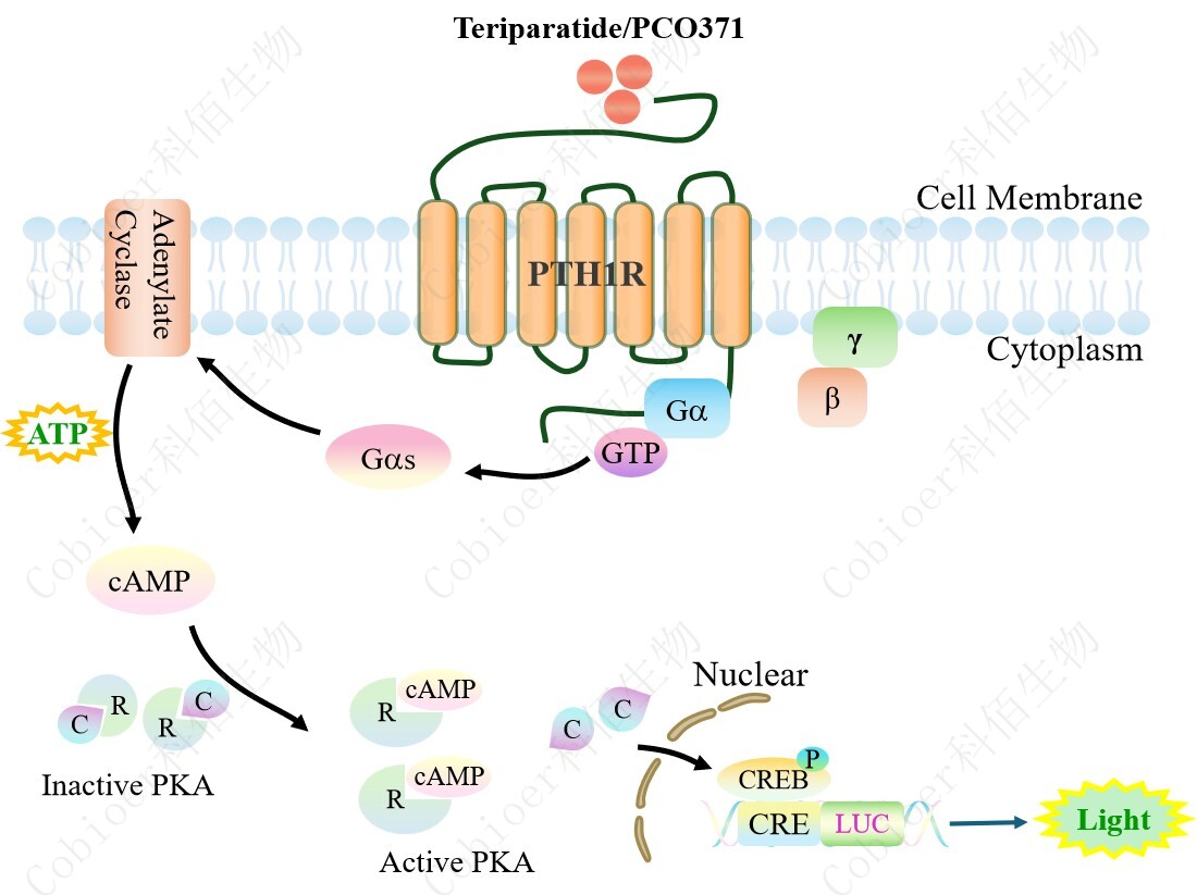 PTH1R CRE-Luc HEK293 報(bào)告基因藥靶模型很好的模擬了體內(nèi) PTH1R 的信號(hào)轉(zhuǎn)導(dǎo)過程,原理見下圖所示。 ![]() Figure 1. PTH1R CRE-Luc HEK293 細(xì)胞模型原理圖 |
