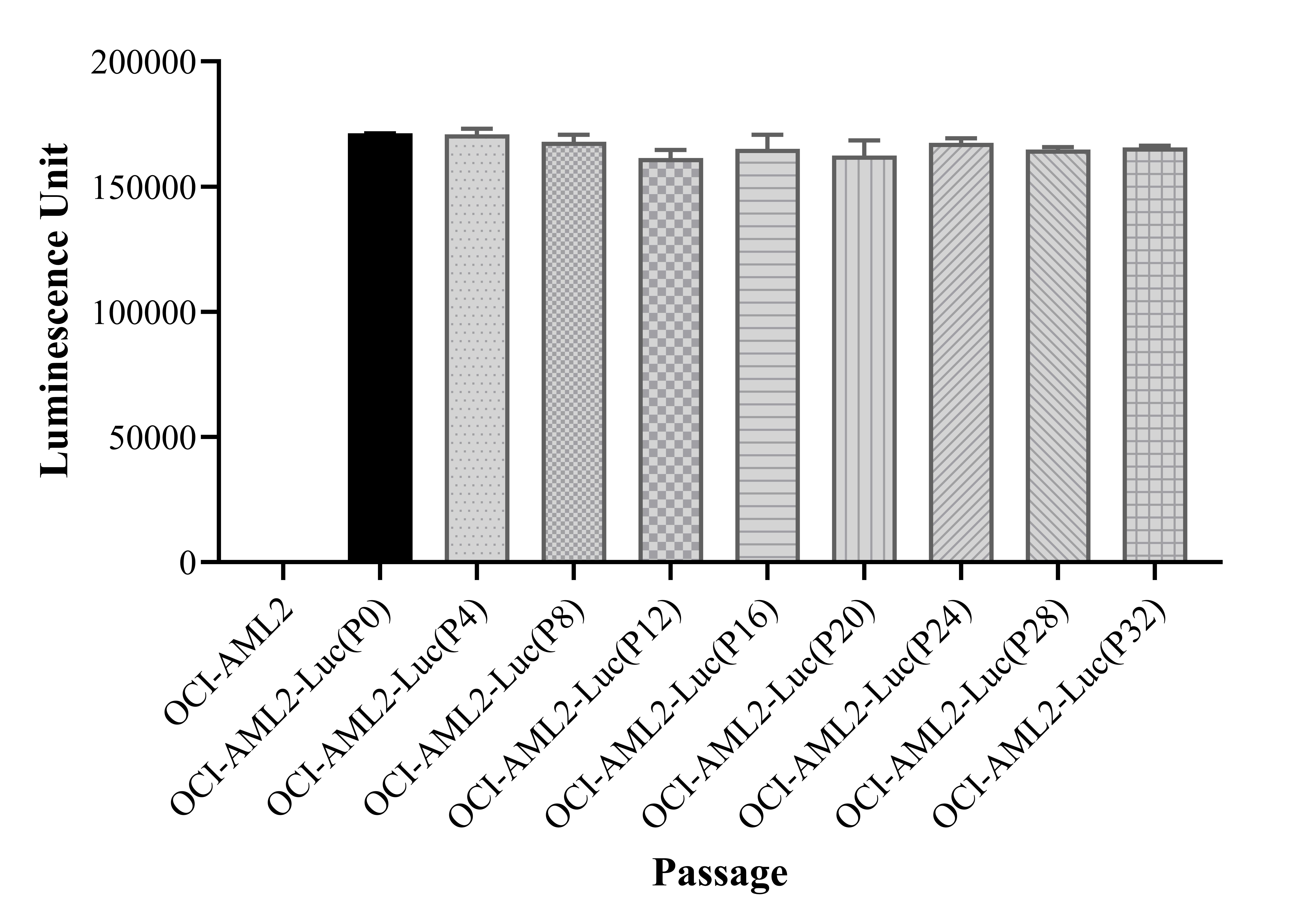Figure 1. Stablity test results. OCI-AML2-Luc showed at least 32 passage stability with similar luminescence unit. |