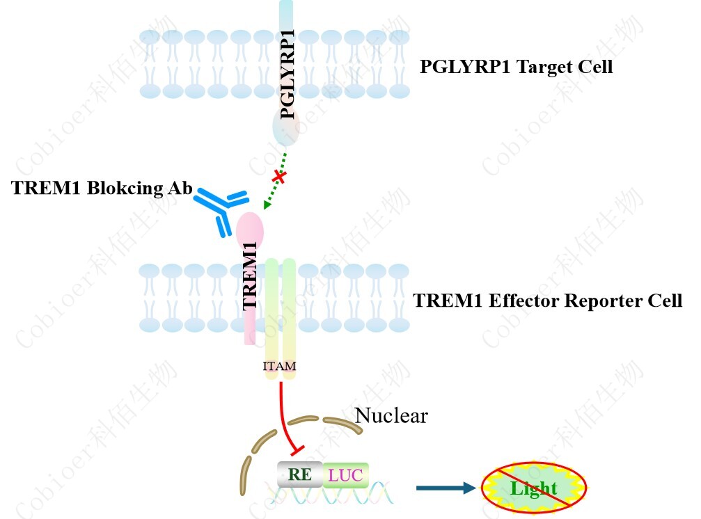 PGLYRP1 Target Cell 作為 TREM1 Effector Reporter Cell 的靶細胞,很好的模擬了體內(nèi) TREM1 的信號轉(zhuǎn)導過程,原理見下圖所示。
