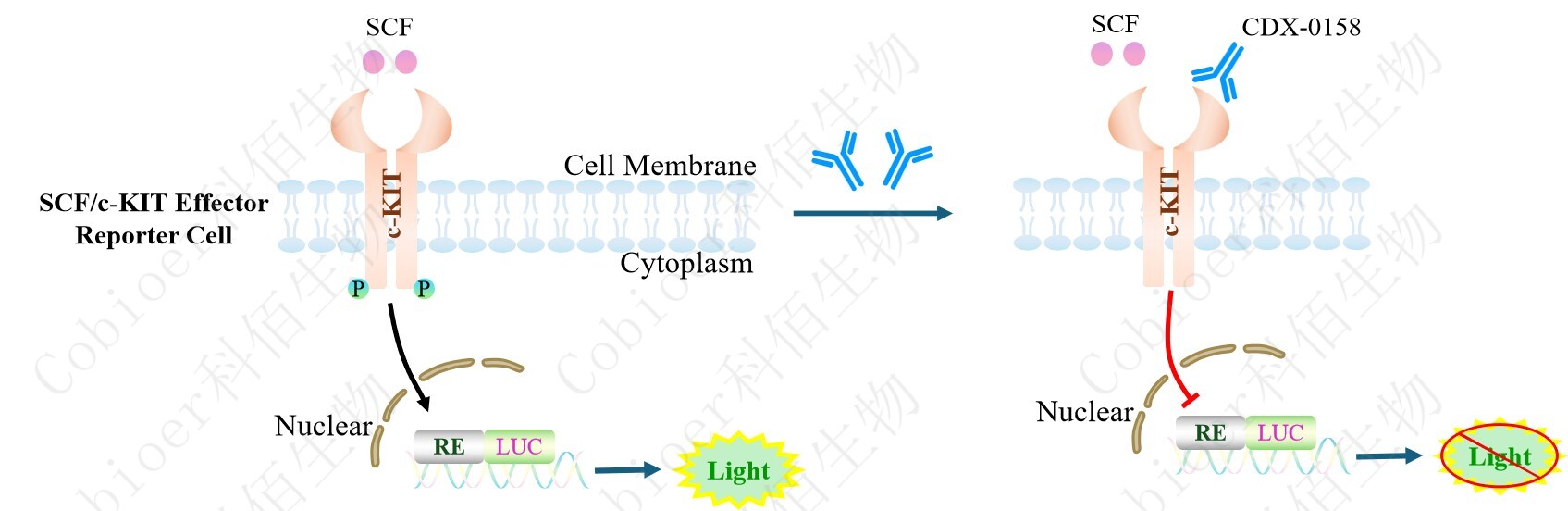 SCF/c-KIT Effector Reporter Cell 報告基因藥靶模型很好的模擬了體內(nèi) SCF/c-KIT 的信號轉(zhuǎn)導(dǎo)過程,原理見下圖所示。