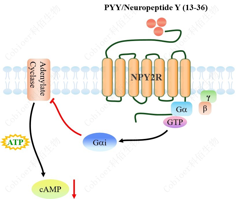 cAMP 在 G 蛋白偶聯(lián)受體(GPCR)信號(hào)轉(zhuǎn)導(dǎo)中是一種關(guān)鍵的第二信使。當(dāng)配體結(jié)合 到 GPCR,構(gòu)象發(fā)生變化,激活受體接著激活 G 蛋白,Gi 的激活導(dǎo)致腺苷酸環(huán)化酶調(diào)控 cAMP 的下調(diào)。NPY2R CHO 藥靶模型很好的模擬了體內(nèi) NPY2R 的信號(hào)轉(zhuǎn)導(dǎo)過(guò)程,原理見(jiàn) 下圖所示。