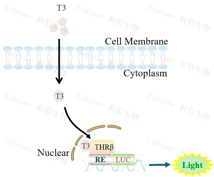 THRB Luciferase Reporter HEK293,是由 THRB 調(diào)控并表達(dá) Luc 熒光素 酶報告基因的 HEK293 細(xì)胞。甲狀腺激素(T3/T4)是一種有效的甲狀腺激素,主要通過結(jié) 合 TRs 發(fā)揮作用,調(diào)控基因表達(dá)和細(xì)胞功能,原理見下圖所示。![]() Figure 1. THRB Luciferase Reporter HEK293 原理示意圖