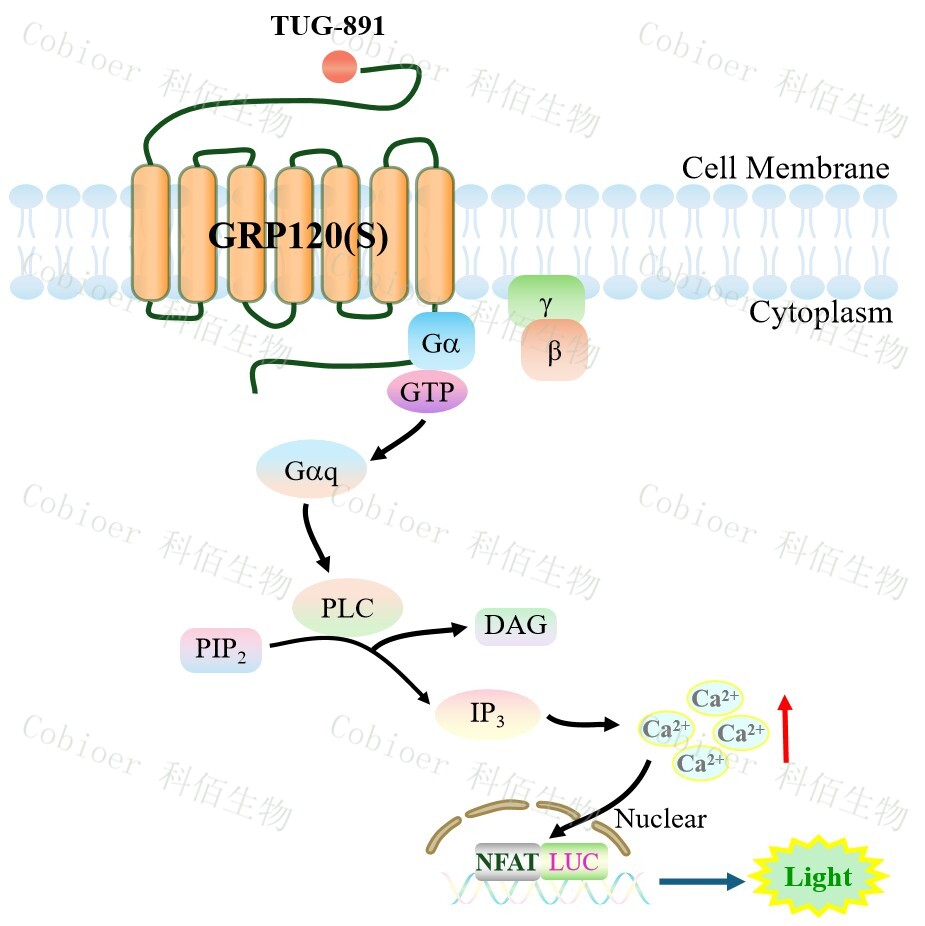 GPR120 與配體結(jié)合,導(dǎo)致 Gαq 亞基的激活,觸發(fā) PLC-γ,從而產(chǎn)生兩個第二信使: IP3 和 DAG,它們參與細胞內(nèi)鈣動員。鈣離子濃度升高激活了 NFAT 轉(zhuǎn)錄因子家族。 GPR120(S) NFAT-Luc HEK293 細胞藥靶模型很好的模擬了體內(nèi) GPR120 的信號轉(zhuǎn)導(dǎo)過程, 原理見下圖所示。