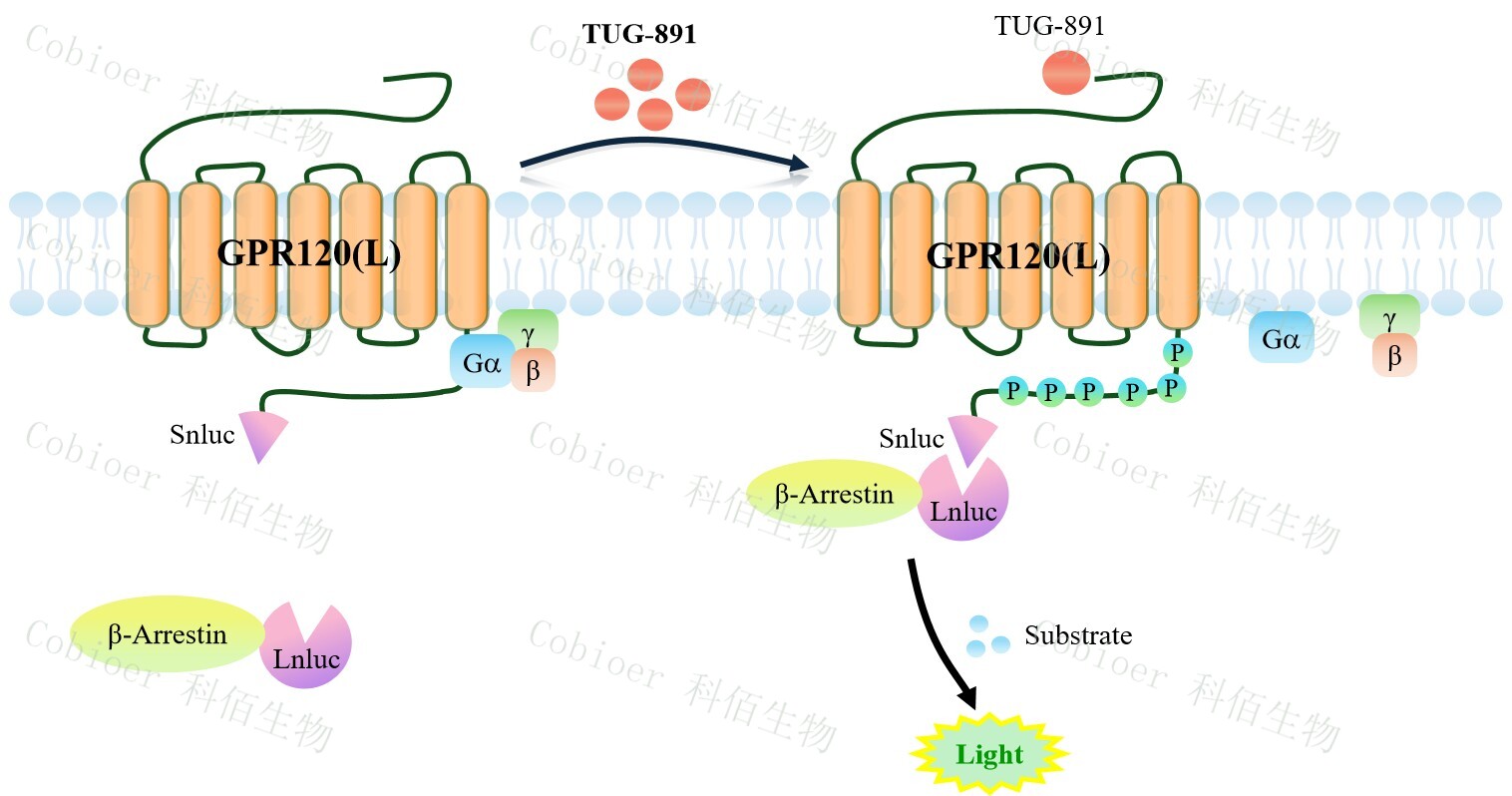 游離脂肪酸(FA)在人體新陳代謝中起著至關重要的作用,并參與許多生理過程。其 中,omega-3 脂肪酸(ω-3FAs)以其潛在的健康益處而聞名,尤其是抗炎作用,并可能改 善心血管和大腦功能。GPR120,也稱為游離脂肪酸受體 4 (FFAR4),已被確定為 ω-3 FAs 的受體,負責介導其抗炎和胰島素增敏作用。 GPR120 可以耦合到多個傳感器(Gq、Gi、Gs 和 β-arrestins)來介導不同的下游信號 傳導。 GPR120 激動劑,包括內源性飽和 9-羥基硬脂酸(9-HSA)、不飽和亞油酸(LA, ω-6 FA)和油酸(OA,ω-9 FA)、天然產物二十碳五烯酸(EPA,ω-3 FA)和合成激動劑 TUG891。TUG891 有明顯的 Gq 偏向活性,只有 EPA 可以激活 Gs 信號。 |