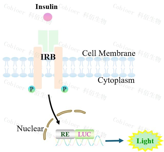 IRB Effector Reporter Cell 報(bào)告基因藥靶模型很好的模擬了體內(nèi) Insulin 的信號(hào)轉(zhuǎn)導(dǎo)過(guò)程, 原理見(jiàn)下圖所示。