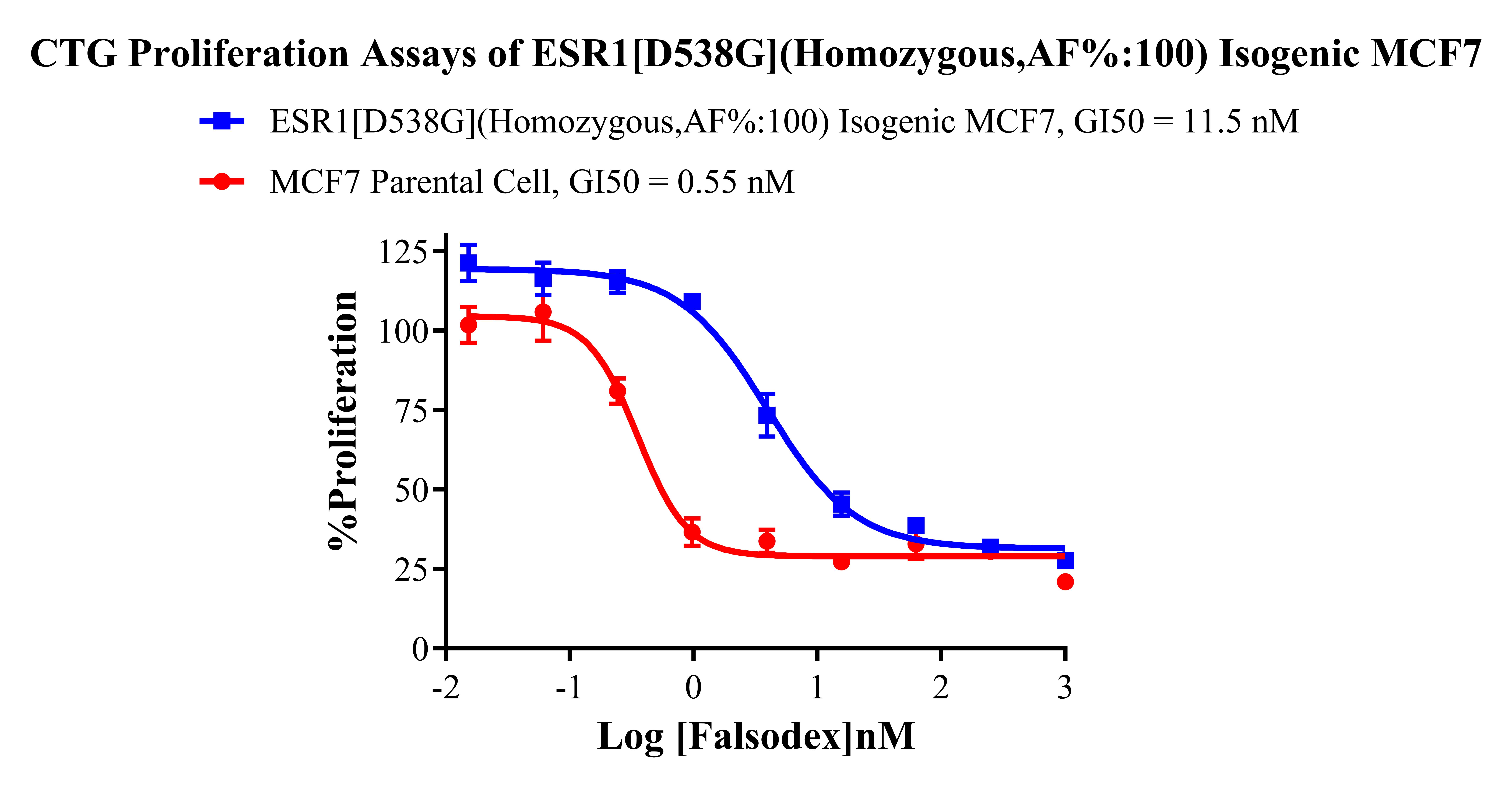 ![]() Figure 2. Sanger of ESR1[D538G](Homozygous,AF%:100) Isogenic MCF7. ![]() Figure 3. A: MCF7 Parental Cell;B:ESR1[D538G](Homozygous,AF%:100)Isogenic MCF7 通道 2 藍(lán)色微滴代表 ESR1[D538G]突變陽性,通道 2 綠色微滴代表該位點為陰性野生型 ![]() Figure 4. CTG Proliferation Assays of ESR1 [D538G](Homozygous,AF%:100) Isogenie MCF7. |