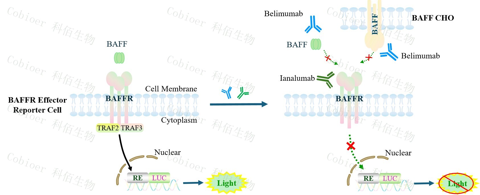 BAFFR Effector Reporter Cell 報(bào)告基因藥靶模型很好的模擬了體內(nèi) BAFF 的信號(hào)轉(zhuǎn)導(dǎo)過程,原理見下圖所示。![]() Figure 1. BAFFR Effector Reporter Cell 細(xì)胞模型原理圖 |