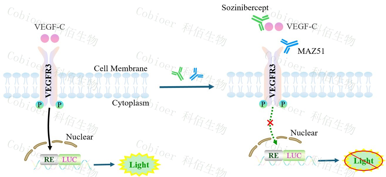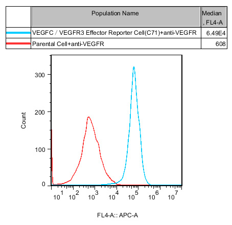 VEGFC/VEGFR3 Effector Reporter Cell 報(bào)告基因藥靶模型很好的模擬了體內(nèi) VEGFC/VEGFR3 的信號(hào)轉(zhuǎn)導(dǎo)過程,原理見下圖所示。![]() Figure 1. VEGFC/VEGFR3 Effector Reporter Cell 細(xì)胞模型原理圖 |