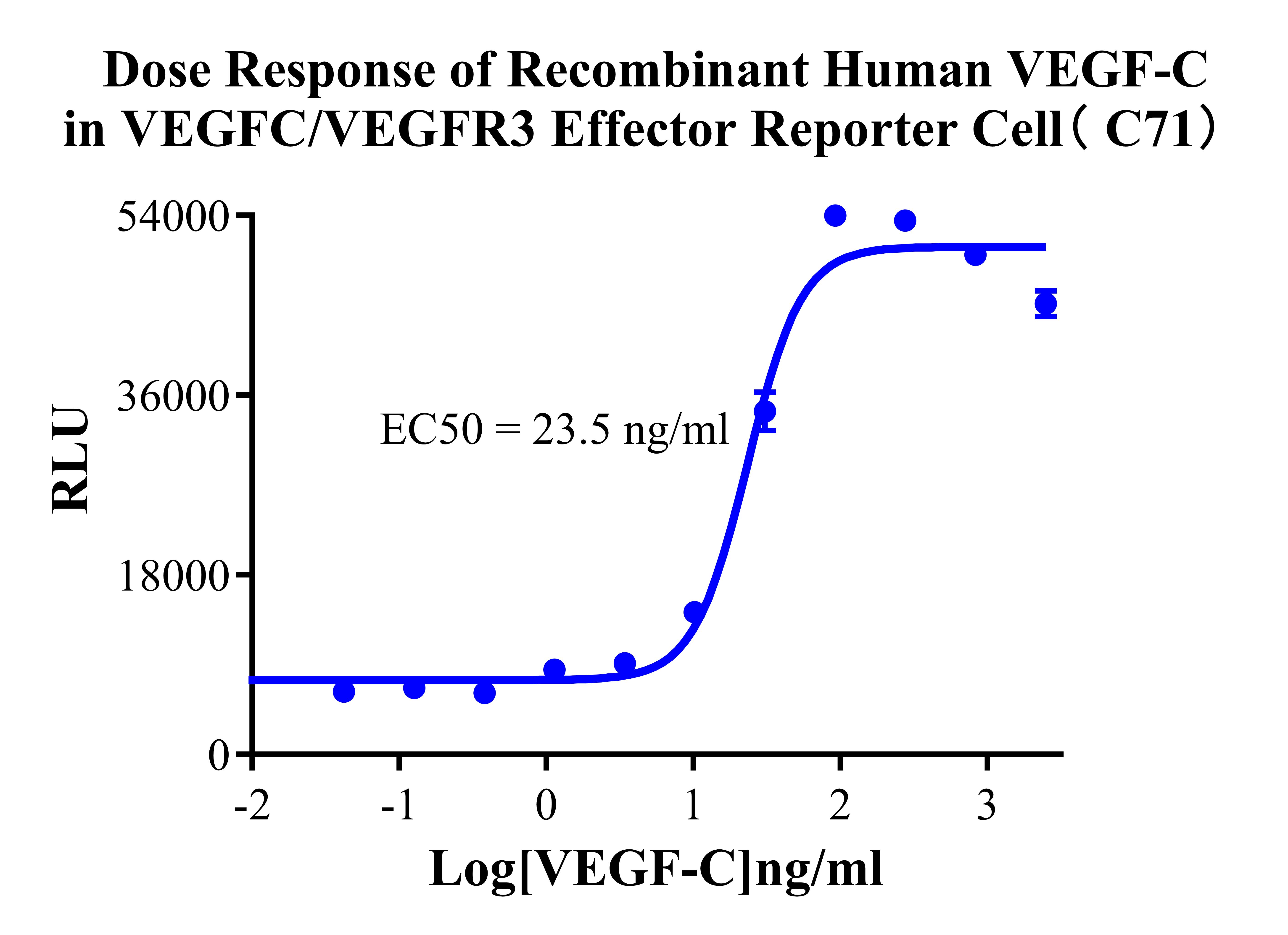 VEGF 又稱血管通透性因子(VPF),是一種二聚體糖蛋白,與細(xì)胞表面的 VEGF 受 體(VEGFR)結(jié)合,從而激活細(xì)胞內(nèi)酪氨酸激酶,啟動(dòng)一系列參與血管生成和血管生成的 信號(hào)級(jí)聯(lián)反應(yīng)事件。在哺乳動(dòng)物中,VEGF 家族有 5 個(gè)成員:VEGFA、VEGFB、VEGFC、 VEGFD 和胎盤生長(zhǎng)因子(PGF)。VEGFC 是分泌型二聚體糖蛋白(全長(zhǎng) 58 kDa),需經(jīng) 蛋白酶(如 ADAMTS3)切割激活為 21 kDa 成熟肽以增強(qiáng)其生物活性,其核心功能是主導(dǎo) 淋巴管生成,在發(fā)育期廣泛表達(dá)于心、腎、腦間充質(zhì),成年后主要富集于淋巴管內(nèi)皮周細(xì) 胞、巨噬細(xì)胞及腫瘤微環(huán)境,通過驅(qū)動(dòng)胚胎淋巴系統(tǒng)發(fā)育和成體淋巴重塑發(fā)揮關(guān)鍵作用。 VEGF 家族成員以重疊的方式結(jié)合三種受體酪氨酸激酶(VEGFR1、VEGFR2 和 VEGFR3)。這些受體都屬于跨膜酪氨酸激酶受體,包括三個(gè)主要區(qū)域,即細(xì)胞外區(qū)域、 跨膜區(qū)域和細(xì)胞內(nèi)羧基端。當(dāng) VEGF 與其受體結(jié)合時(shí),形成同源二聚體復(fù)合物,使其蛋白 構(gòu)象發(fā)生改變,酪氨酸殘基發(fā)生自磷酸化并將信號(hào)傳導(dǎo)到下游。 |