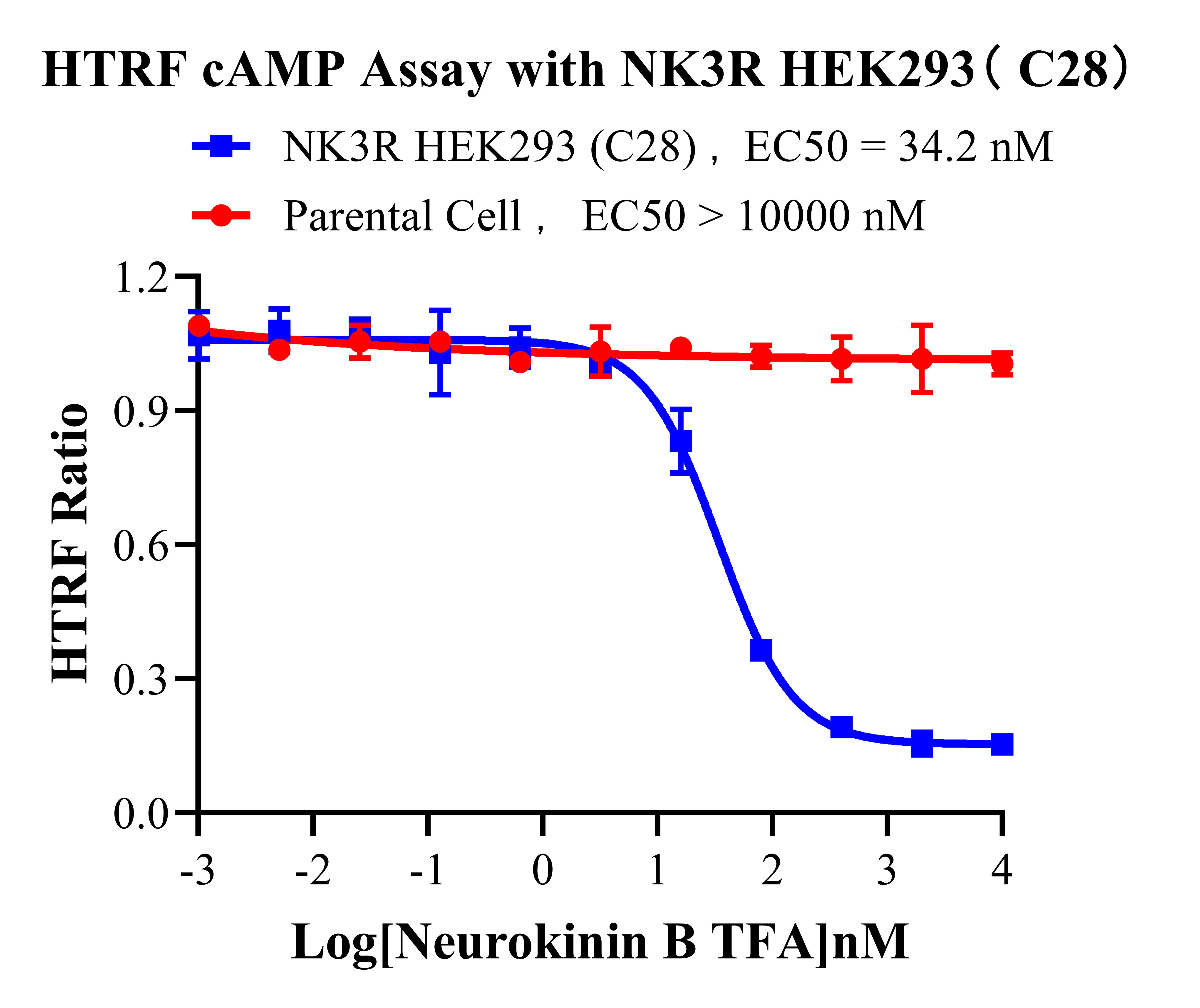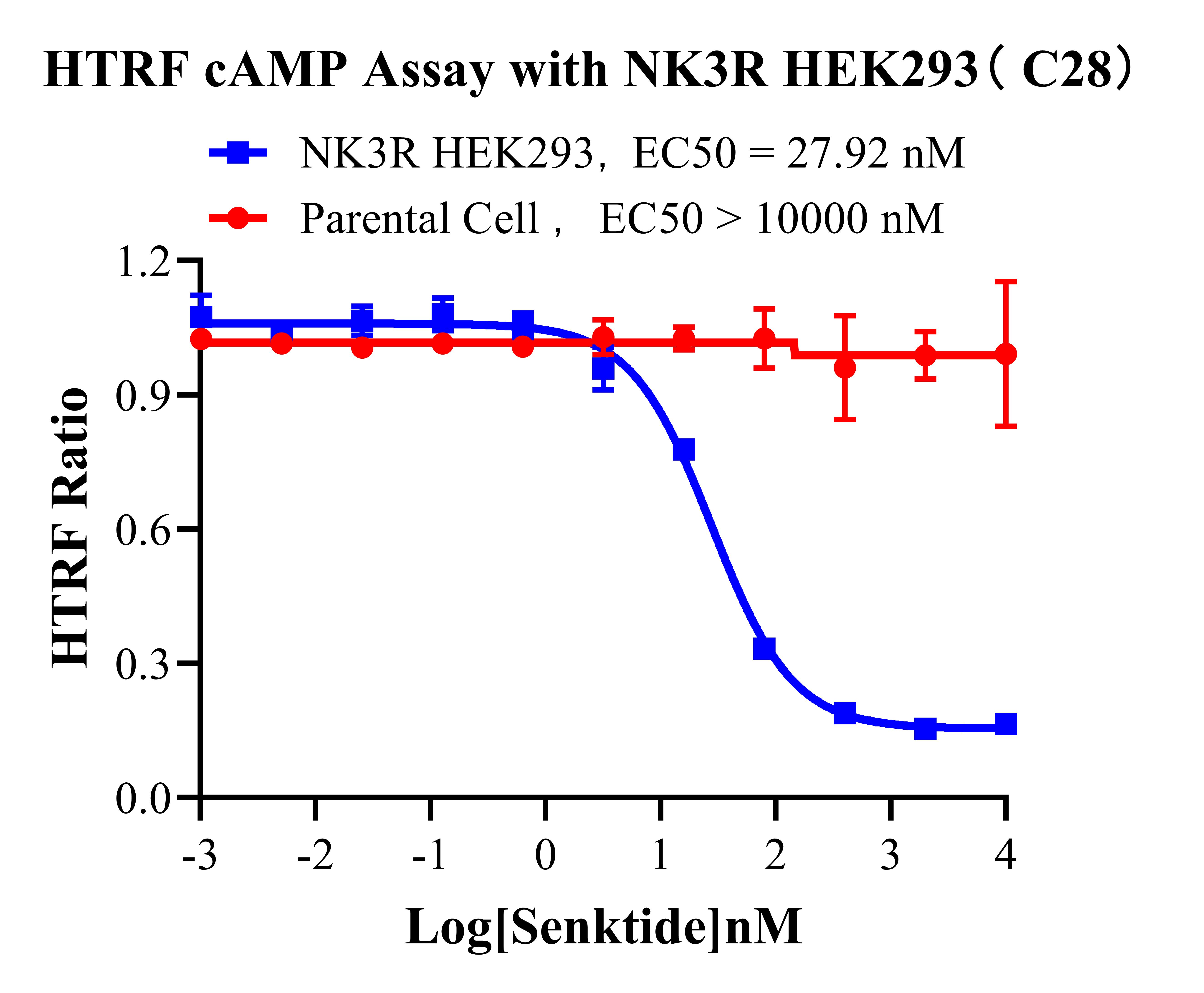 cAMP 在 G 蛋白偶聯(lián)受體(GPCR)信號轉(zhuǎn)導(dǎo)中是一種關(guān)鍵的第二信使。當(dāng)配體結(jié)合 到 GPCR,構(gòu)象發(fā)生變化,激活受體接著激活 G 蛋白,Gs 的激活導(dǎo)致腺苷酸環(huán)化酶調(diào)控 cAMP 的升高。NK3R HEK293 細(xì)胞藥靶模型很好的模擬了體內(nèi) NK3R 的信號轉(zhuǎn)導(dǎo)過程,原 理見下圖所示。