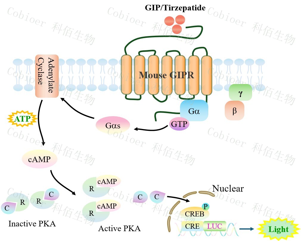 Mouse GIPR CRE-Luc HEK293 報告基因藥靶模型很好的模擬了體內(nèi) GIPR 的信號轉(zhuǎn)導(dǎo)過程,原理見下圖所示。