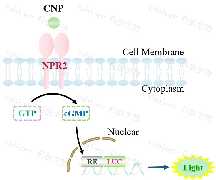 NPR2 Effector Reporter Cell 報(bào)告基因藥靶模型很好的模擬了體內(nèi) NPR2 的信號(hào)轉(zhuǎn)導(dǎo)過(guò)程,原理見下圖所示。