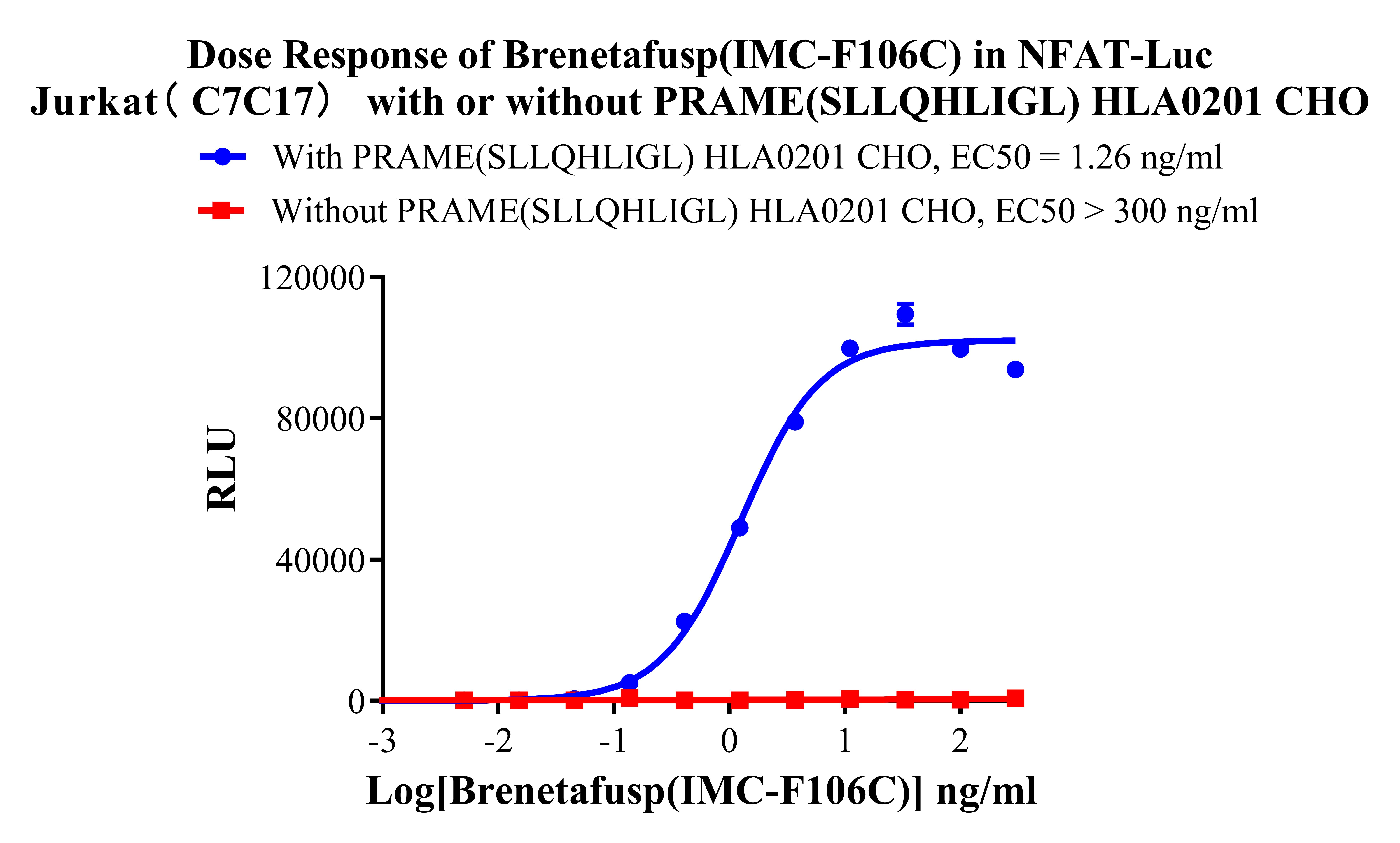 Figure 1.Dose Response of Brenetafusp (IMC-F106C)in NFAT-Luc Jurkat( C7C17) with or without PRAME(SLLQHLIGL) HLA0201 CHO. |