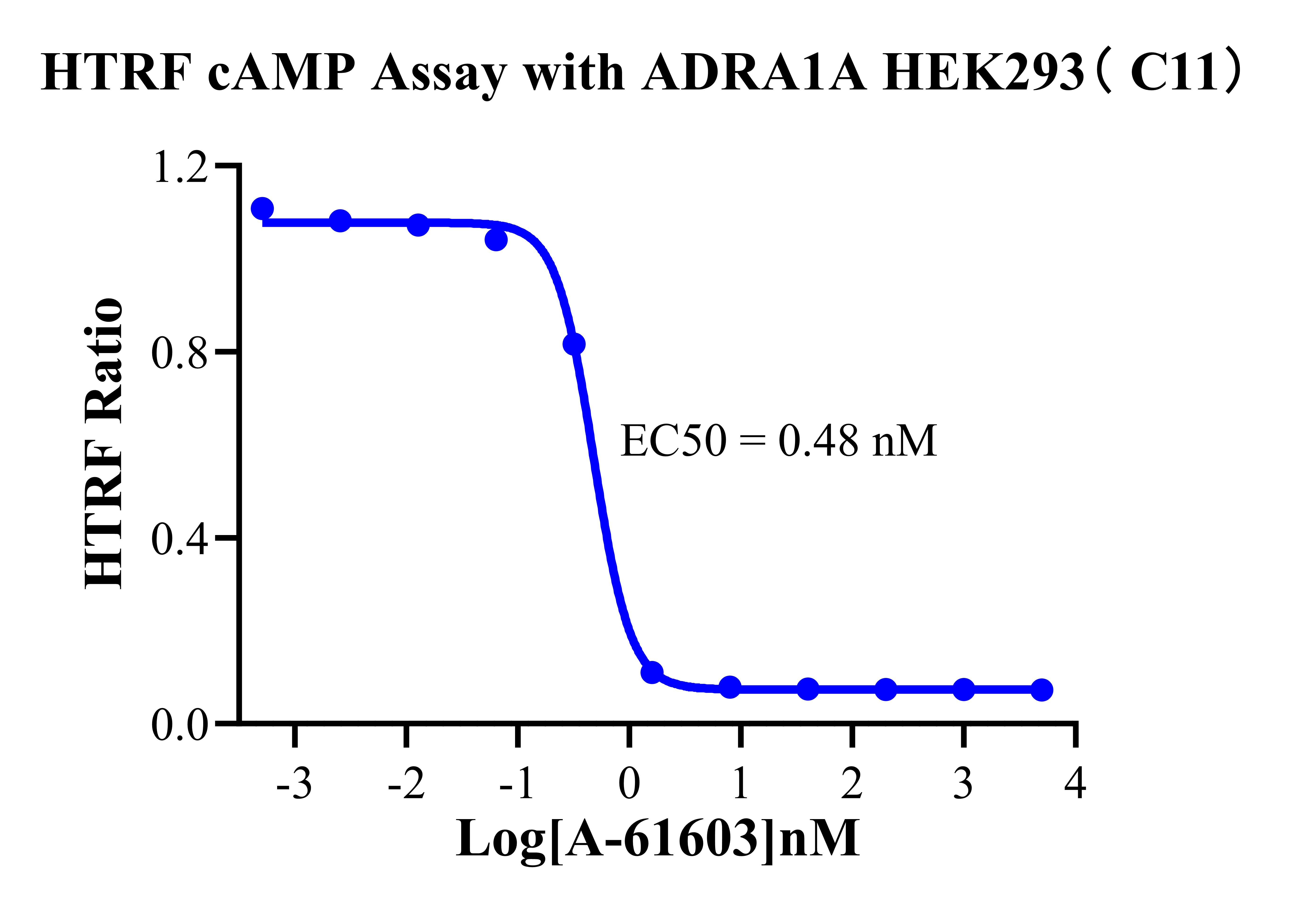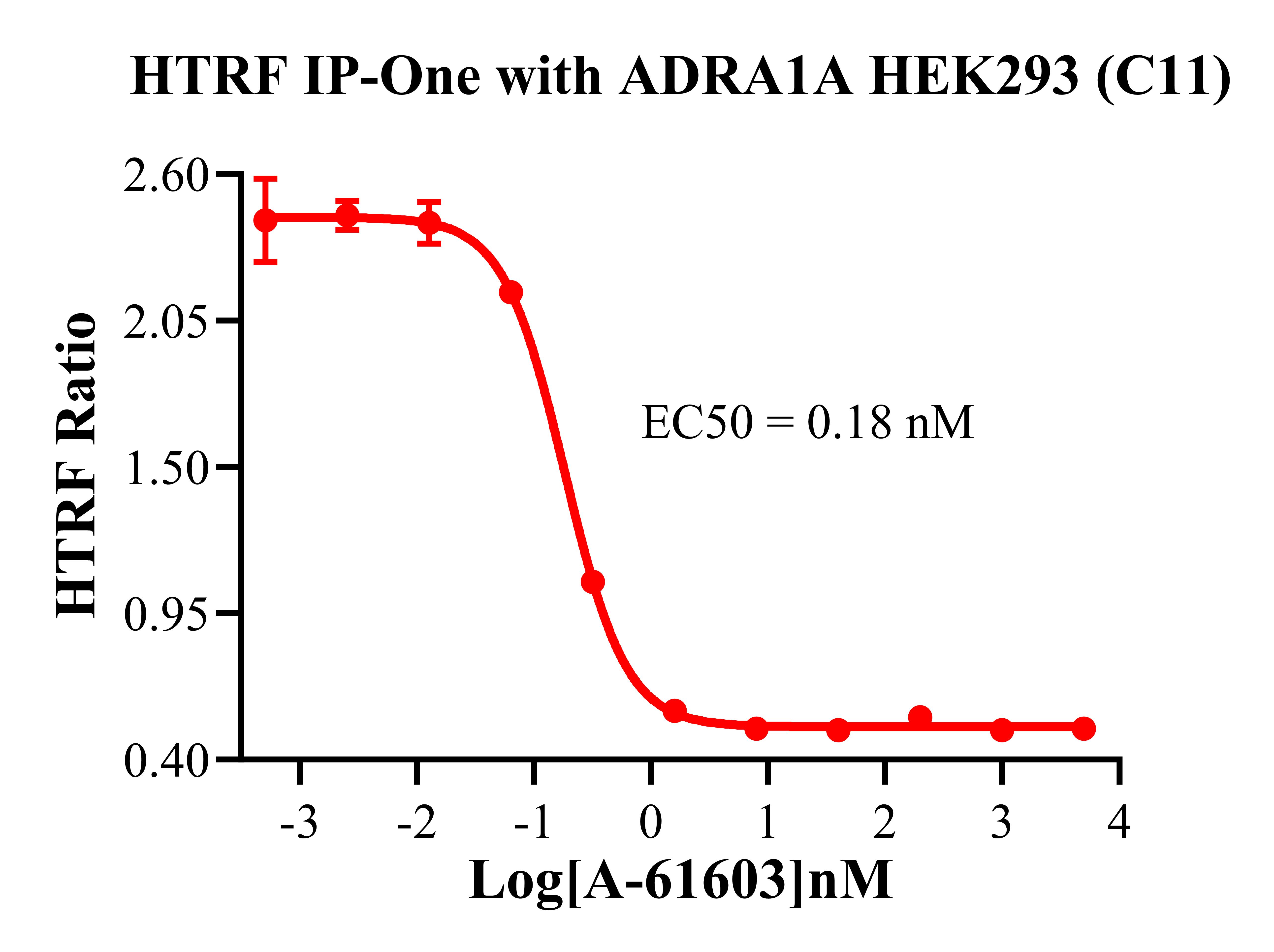 ADRA1A 還可以通過 Gq 蛋白的信號通路,調(diào)控 IP1 的升高。ADRA1A 與配體結(jié)合, 導致 Gαq 亞基的激活,觸發(fā) PLC-γ,從而產(chǎn)生兩個第二信使:IP3 和 DAG,它們參與細胞 內(nèi)鈣動員。由于 IP3 在代謝上不穩(wěn)定,因此測量通路激活的替代標志物 IP1 作為檢測標準。