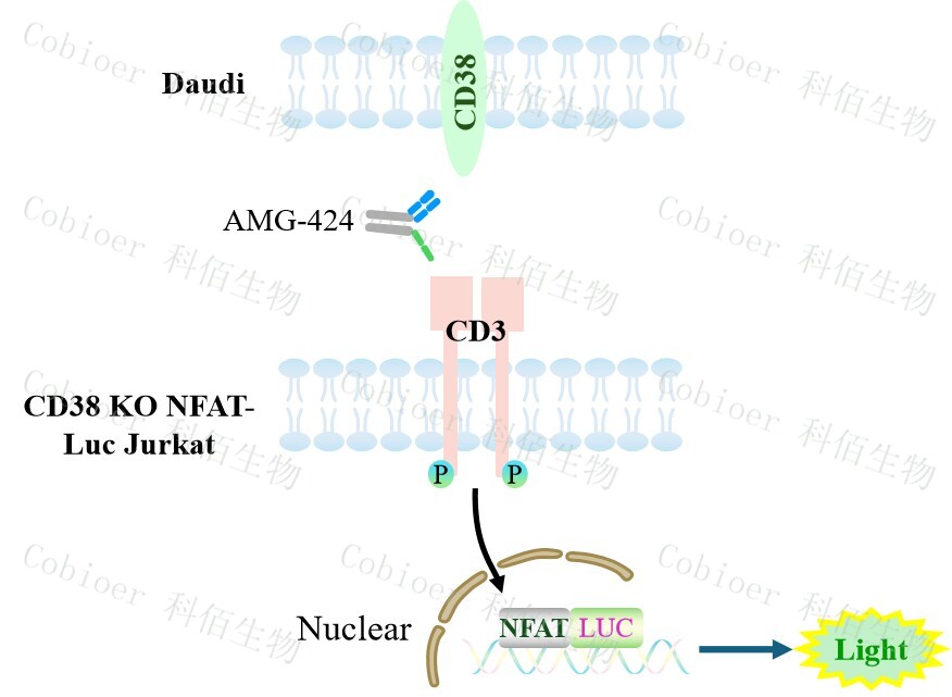 CD38 KO NFAT-Luc Jurkat Cell 報(bào)告基因藥靶模型通過(guò)報(bào)告基因的信號(hào)反映 T 細(xì)胞受體 (TCR)信號(hào)通路的激活水平,原理見(jiàn)下圖所示。![]() Figure 1. CD38 KO NFAT-Luc Jurkat Cell 細(xì)胞模型圖 |