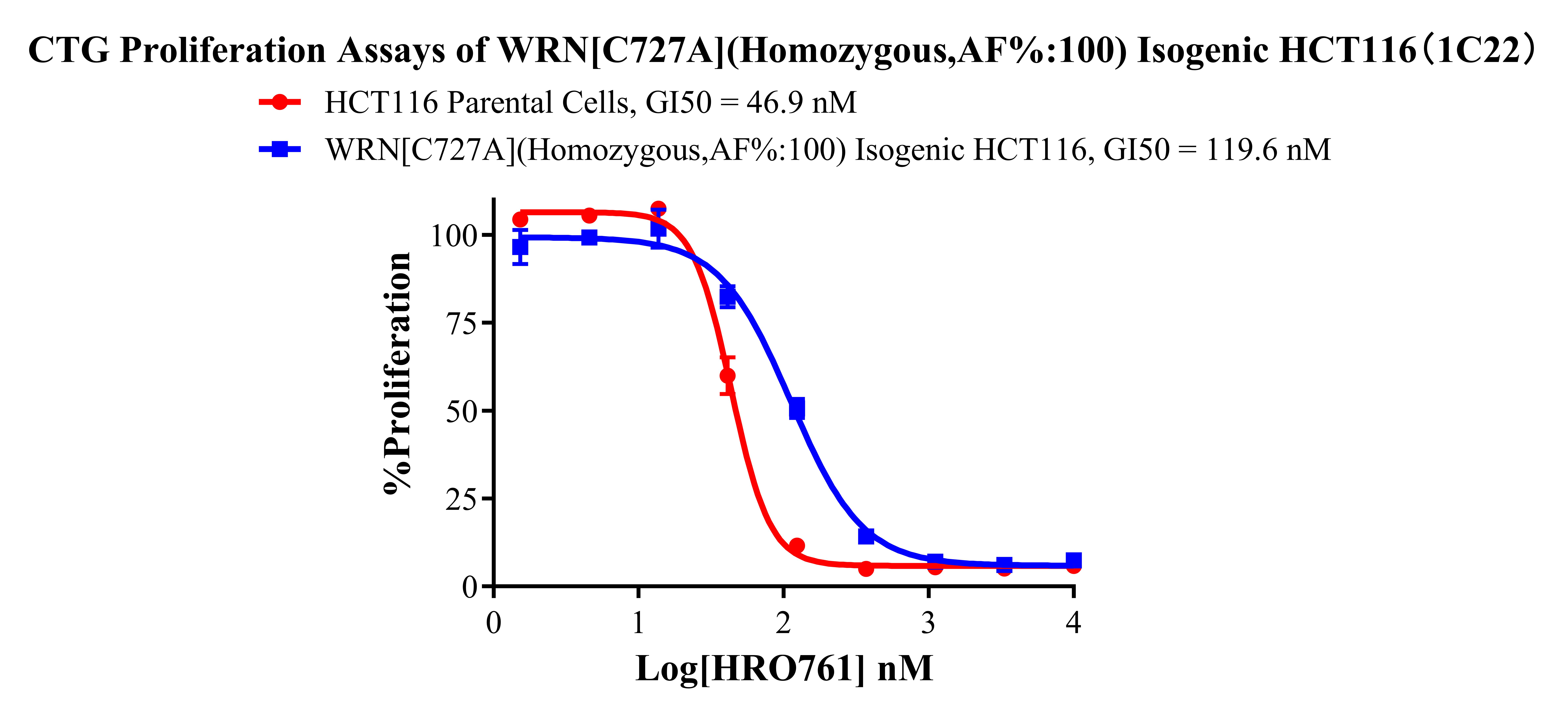 ![]() Figure 2. Sanger of WRN[C727A](Homozygous,AF%:100) Isogenic HCT116 ![]() Figure 3. A:HCT116 Parental Cell;B:WRN[C727A](Homozygous,AF%:100) Isogenic HCT116 通道2 藍(lán)色微滴代表WRN[C727A]突變陽性,通道2 綠色微滴代表該位點(diǎn)為陰性野生型 ![]() Figure 4. CTG Proliferation Assays of WRN[C727A](Homozygous,AF%:100) Isogenic HCT116(1C22). ![]() Figure 5. CTG Proliferation Assays of WRN[C727A](Homozygous,AF%:100) Isogenic HCT116(1C22). |