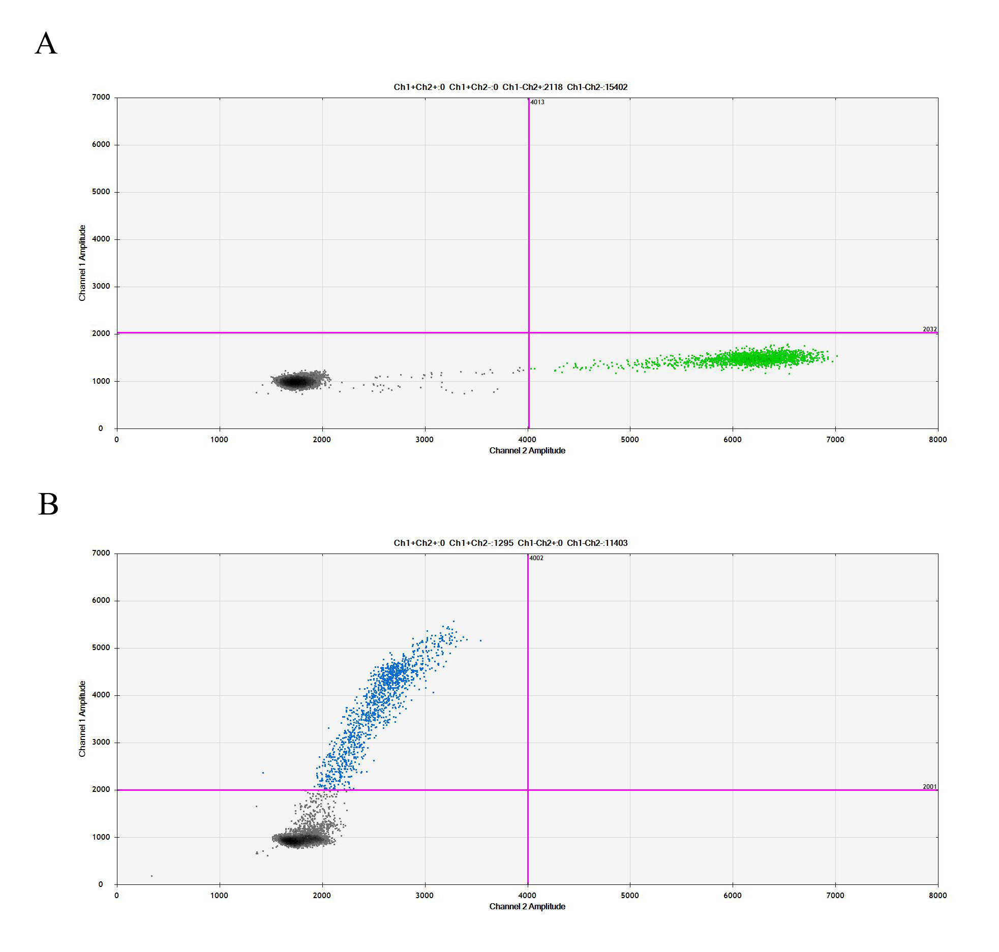 ![]() Figure 2. Sanger of ESR1[Y537N](Homozygous,AF%:100) Isogenic MCF7. ![]() Figure 3. A:MCF7 Parental Cell;B:ESR1[Y537N](Homozygous,AF%:100) Isogenic MCF7 通道2 藍(lán)色微滴代表ESR1[Y537N]突變陽(yáng)性,通道2 綠色微滴代表該位點(diǎn)為陰性野生型 ![]() Figure 4. CTG Proliferation Assay of ESR1[Y537N(Homozygous,AF%:100) Isogenie MCF7(1C8). |