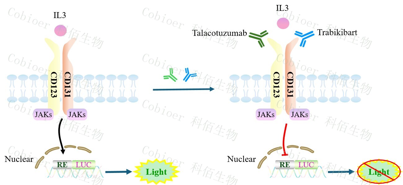 IL3 Effector Reporter Cell 報告基因藥靶模型很好的模擬了體內 IL3 的信號轉導過程,原理見下圖所示。
