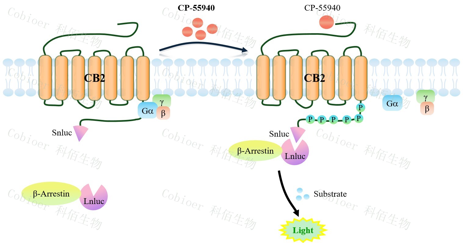 CB2 β-Arrestin CHO 報告基因藥靶模型很好的模擬了體內(nèi) CB2/β-Arrestin 的信號轉(zhuǎn)導過程,原理見下圖所示。當缺乏配體刺激時,β-Arrestin 不與 CB2 結(jié)合,融合β-Arrestin 的熒 光素酶處于失活構(gòu)象,當 CB2 遭遇配體刺激時,融合熒光素酶報告基因的β-Arrestin 被招 募,使熒光素酶報告基因處于激活狀態(tài),加入其底物后發(fā)光信號增強。![]() Figure 1. CB2 β-Arrestin CHO 細胞模型原理圖 |