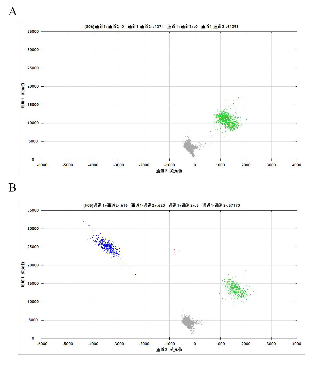 Figure 3. A:HCT116 Parental Cell;B:WRN[C727A](Heterozygous,AF%:50) Isogenic HCT116   通道2 藍(lán)色微滴代表WRN[C727A]突變陽性,通道2 綠色微滴代表該位點(diǎn)為陰性野生型
