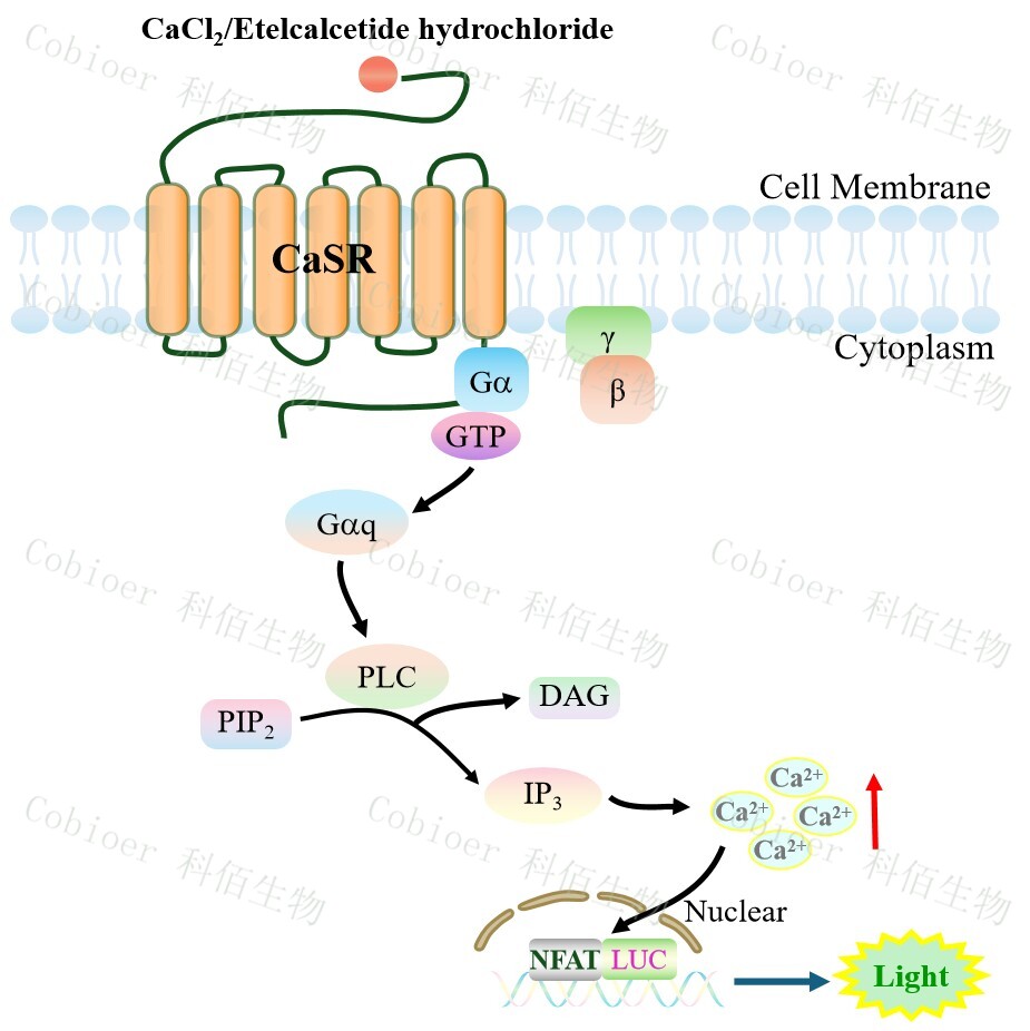 CaSR NFAT-Luc HEK293 細(xì)胞藥靶模型很好的模擬了體內(nèi) CaSR 的信號(hào)轉(zhuǎn)導(dǎo)過(guò)程,原 理見(jiàn)下圖所示。