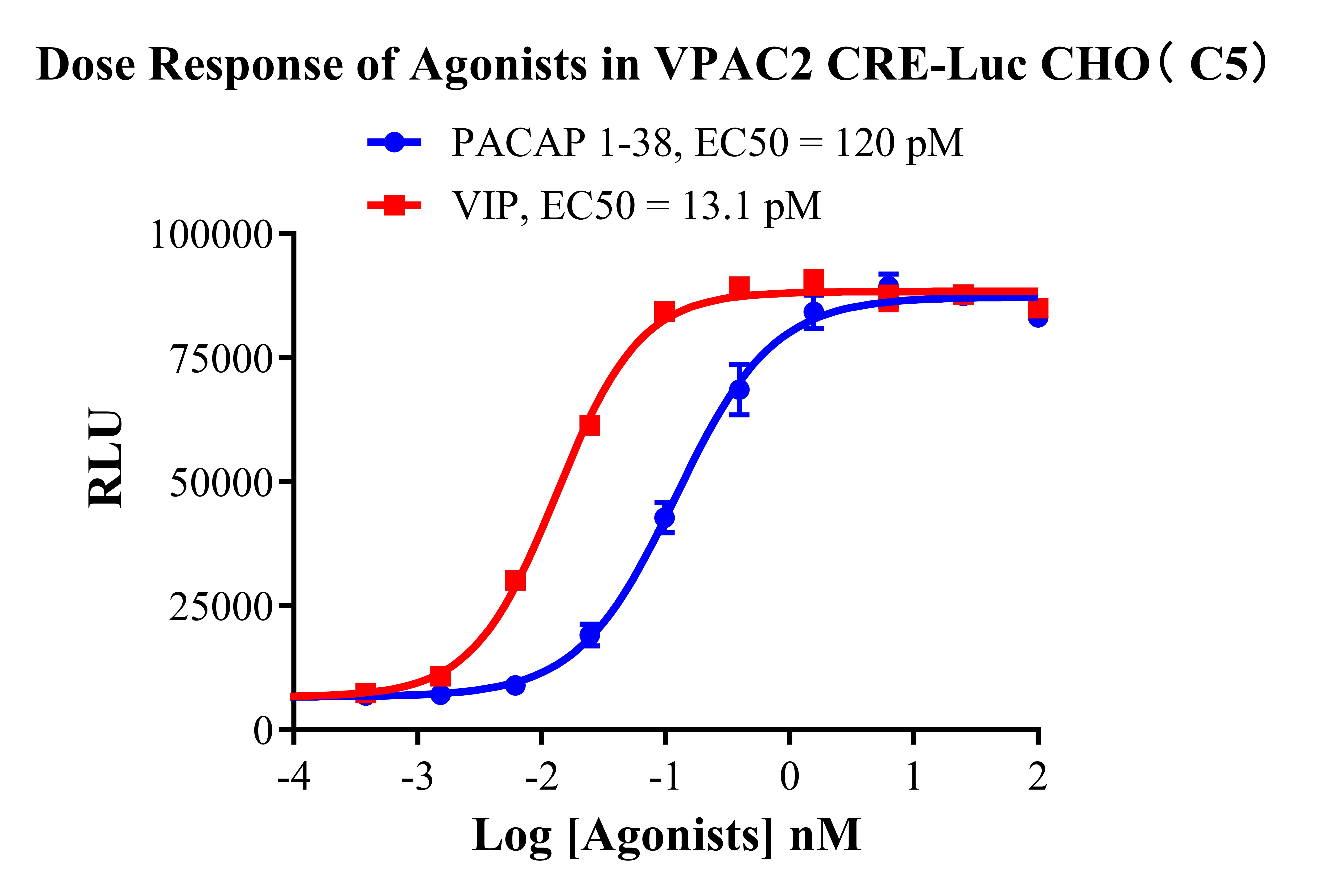 | PACAP/VIP 受體家族屬于 B 類 G 蛋白偶聯(lián)受體(GPCR),包含 PAC1R (PAC1)、 VPAC1R (VPAC1) 和 VPAC2R (VPAC2) 三個(gè)亞型,共同響應(yīng)神經(jīng)肽 PACAP(垂體腺苷酸 環(huán)化酶激活肽)和 VIP(血管活性腸肽)的調(diào)控,通過(guò)激活 Gs/cAMP-PKA 核心信號(hào)軸 (部分亞型偶聯(lián) Gq/PLC)廣泛協(xié)調(diào)神經(jīng)內(nèi)分泌、代謝穩(wěn)態(tài)與免疫調(diào)節(jié)。 VPAC2 受體(血管活性腸肽受體 2 型)作為 B 類 GPCR 的核心亞型,主要富集于下丘 腦視交叉上核(SCN)、胰腺β細(xì)胞、脂肪組織及骨細(xì)胞,以同等高親和力結(jié)合 VIP 和 PACAP,通過(guò) Gs/cAMP-PKA 通路調(diào)控代謝穩(wěn)態(tài)與晝夜節(jié)律。VPAC2 的激活可同步 SCN 生物鐘基因(如 Per2)振蕩以維持睡眠-覺(jué)醒周期、促進(jìn)胰島素/胰高血糖素脈沖式分泌調(diào) 控血糖平衡、抑制破骨細(xì)胞分化并增強(qiáng)骨形成。 | |