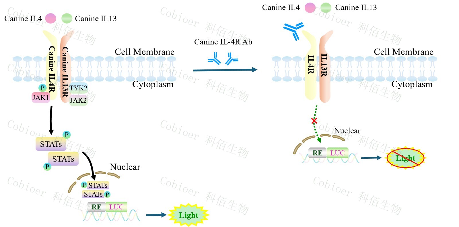 Canine IL4/IL13 Dual Effector Reporter Cell 報告基因藥靶模型很好的模擬了體內(nèi) IL4/IL13 的信號轉(zhuǎn)導(dǎo)過程,原理見下圖所示。