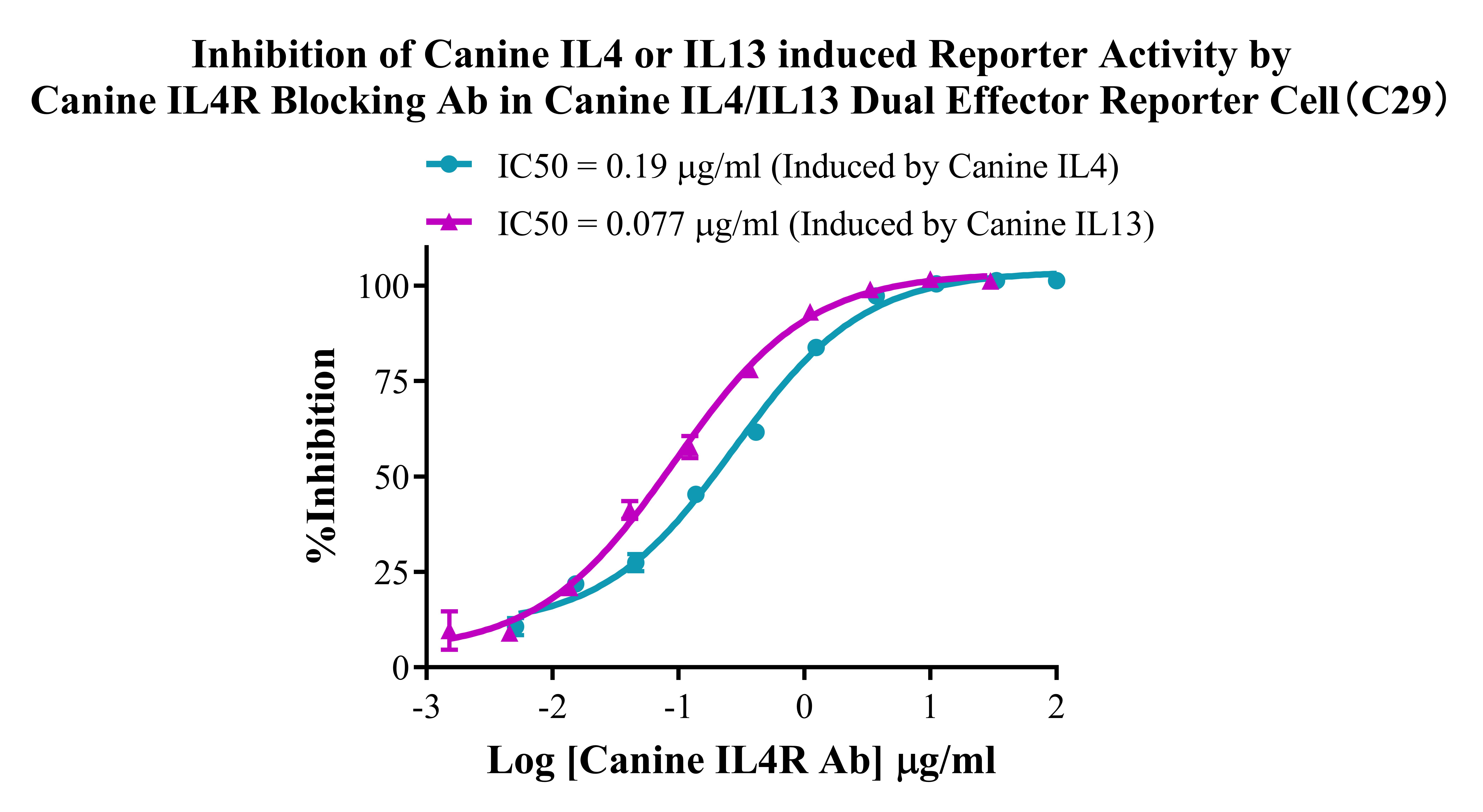 Inhibition of Canine IL4 or IL3 induced Reporter Activity by Canine IL4R Blocking Ab in Canine IL4/IL13 Dual Effector Reporter Cell (C29).