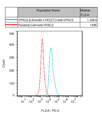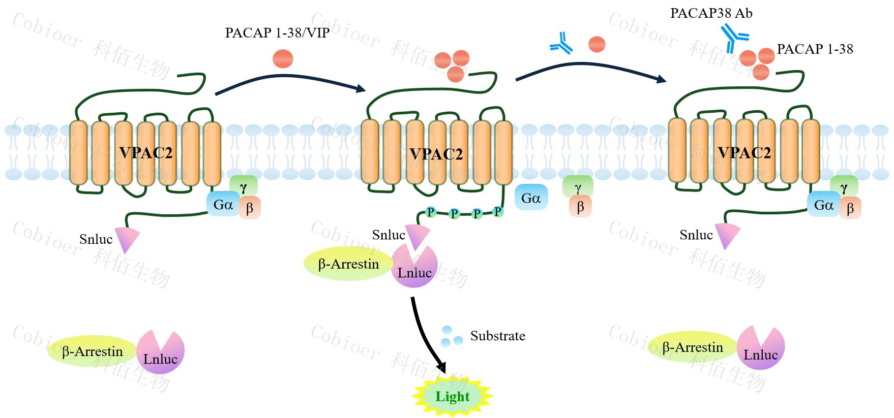 VPAC2 β-Arrestin CHO 報(bào)告基因藥靶模型很好的模擬了體內(nèi) VPAC2/β-Arrestin 的信號(hào)轉(zhuǎn)導(dǎo)過(guò)程,原理見(jiàn)下圖所示。當(dāng)缺乏配體刺激時(shí),β-Arrestin 不與 VPAC2 結(jié)合,融合β- Arrestin 的熒光素酶處于失活構(gòu)象,當(dāng) VPAC2 遭遇配體刺激時(shí),融合熒光素酶報(bào)告基因的 β-Arrestin 被招募,使熒光素酶報(bào)告基因處于激活狀態(tài),加入其底物后發(fā)光信號(hào)增強(qiáng)。![]() Figure 1. VPAC2 β-Arrestin CHO 細(xì)胞模型原理圖 |