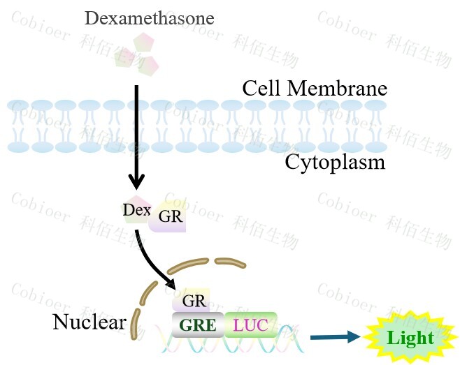 GRE-Luc HEK293 報告基因細胞,是由 GRE 調(diào)控并表達 Luc 熒光素酶 報告基因的 HEK293 細胞。Dexamethasone (Hexadecadrol,地塞米松)是糖皮質(zhì)激素受體 (Glucocorticoid Receptor)激動劑、凋亡誘導(dǎo)劑,原理見下圖所示。![]() Figure 1. GRE-Luc HEK293 細胞原理示意圖 |
